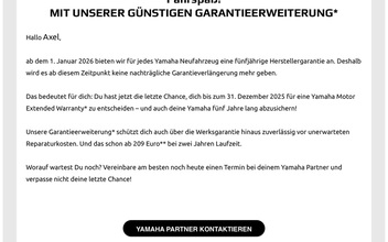 Hat eine Antwort im Thema Yamaha Garantieverlängerung auf 5 Jahre verfasst.BeitragJa, eine schöne Mail, aber aktuell stimmt das wohl nicht mehr. Aktuell wird auf der Webseite nur noch 3 Jahre Garantie angeboten. Die Mail an dich in Ehren, aber sie ist nicht korrekt. Vielleicht passt Yamaha das auch bis zum Frühjahr wieder an und… -