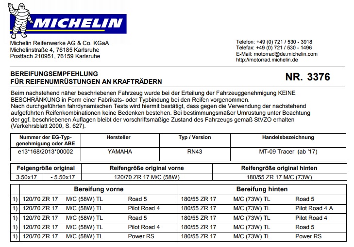 Der neue Reifen von Michelin, der Road 5 ist auch für die Tracer freigegeben.