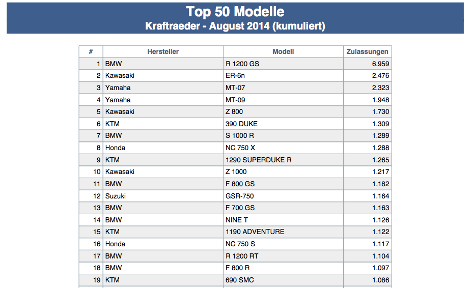 Die Zahlen vom August sind da… Die ersten Plätze bleiben relativ unverändert (die MT-07 holt langsam die ER6N ein):