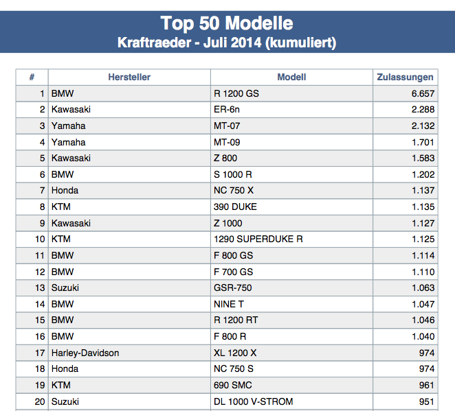 Yamaha immer noch auf Platz 3 (MT-07) und Platz 4 (MT-09), Platz 2 knapp die ER6N, Platz 1 wie immer GS1200