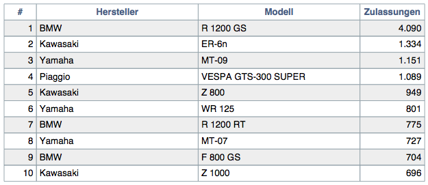 Ups…nur noch Platz 3 (aber über 1.000 Maschinchen) und BMW wird mir langsam unheimlich (da kann was nicht stimmen… die schummeln doch). Und die MT-07 hätte ich deutlich vor der ER6N (Platz 2) erwartet… http://files.vogel.de/vogelonl…e/issues/bub/2014/004.pdf und nachdem Kawasaki trotz mäßiger Presse plötzlich mit 3 Motorrädern unter die ersten 10 rutscht riecht auch verdächtig (außer es sind all die armen, die keine MT mehr bekommen haben oder nicht warten wollten