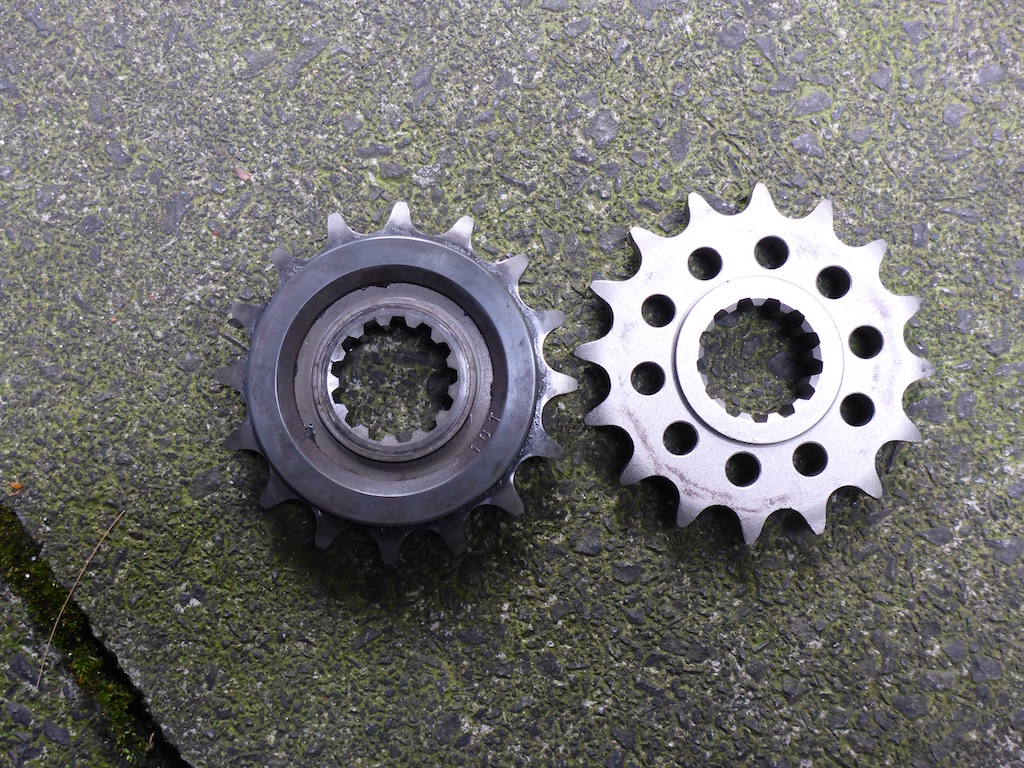 Neue Ritzel montiert, dass alte hat nur minimale Einlaufspuren, aber mit der neuen Kette und da es im Satz eh dabei ist, kam das neue drauf.