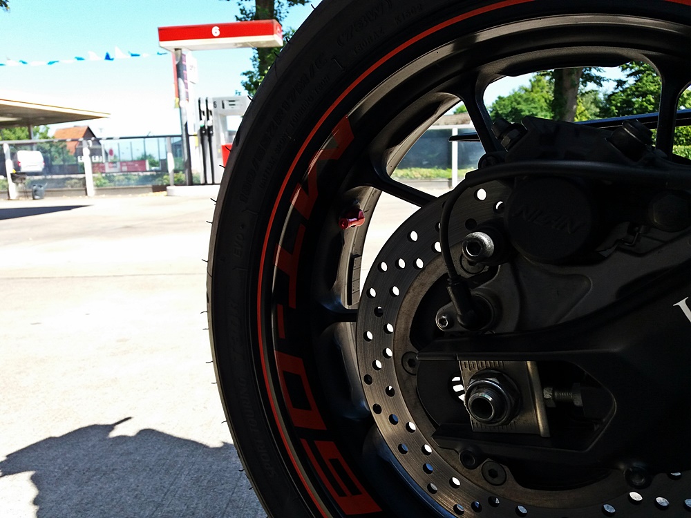 Vorne sind doch die beiden großen Bremsscheiben die einem das Reifendruckprüfen so erschweren.