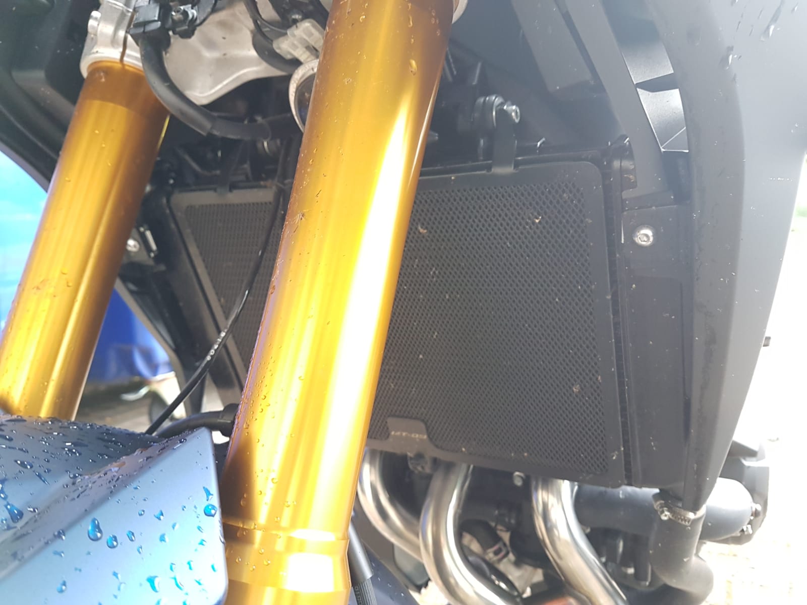Also mein 25 Euro-Schutzgitter von Amazon passt problemlos an der GT und war in ca. 15 Minuten montiert. Einfach oben die beiden Befestigungsschrauben lösen und die Laschen des Gitters mit drunter, unten mittig einen Kabelbinder (wurde mitgeliefert) und fertig.