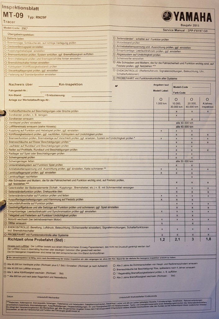 Im Übrigen gibt es für die Inspektionen vorgeschriebene Richtzeiten, die da wären für Typ RN29F, MT-09 und Tracer: