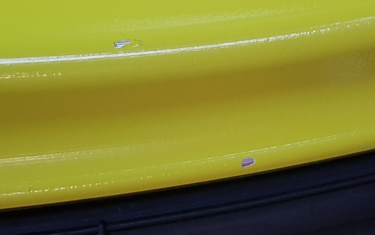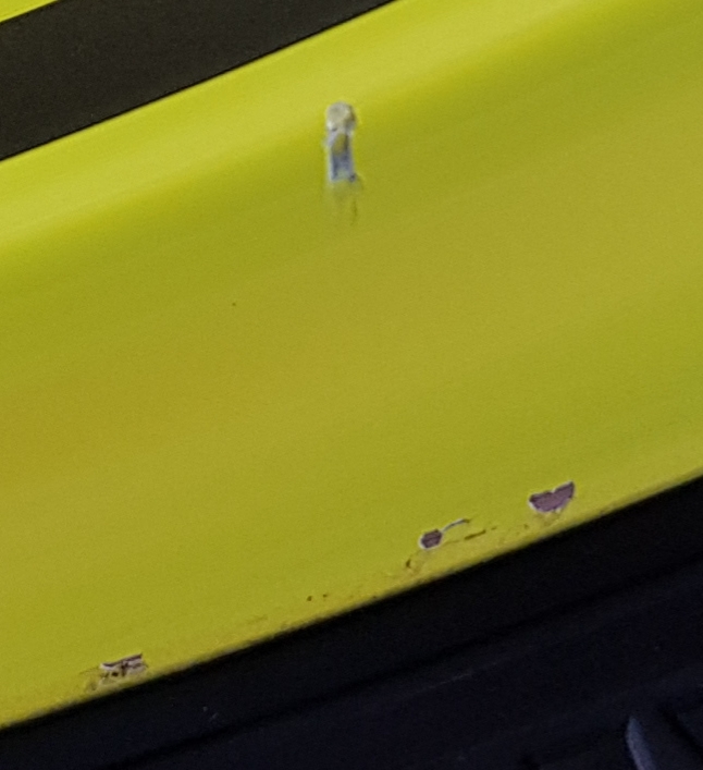 Gibt ordenltich viele und teils grosse Stellen, an denen nur noch Alu ist. Sieht fast aus wie Bordsteinrempler am Auto, aber das kann nicht sein - vor allem überall.
