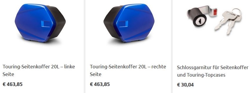 die originalen Seitenkoffer kommen ohne zusätzliche Halterung aus und sind optisch natürlich sehr schön, aber mit 20 Liter nicht wirklich groß und preislich sehr kostenintensiv.