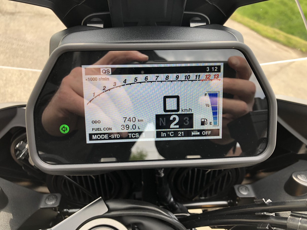 Losgefahren, erste Slalom Übungen, Gänge durchschalten - alles wie gewohnt, nichts neues. Durch 2 Ortschaften gequält bis dann die kurvige Landstraße begann. Erst einmal voll durchgeladen und die Gänge hochgeknallt - Quickshifter macht das schon. Butterweiches Hoch- und Runterschalten. Kein Ruckeln, kein KFR. Nur der Durchzug könnte gefühlt stärker sein. Gut möglich dass man die Gasannahme etwas Tourentauglich abgestimmt hat. Modus STD und Traktionskontrolle auf 1. Leistungstechnisch wirklich sehr ausreichend, nicht so bissig wie die MT, was durchaus Positiv verstanden kann.