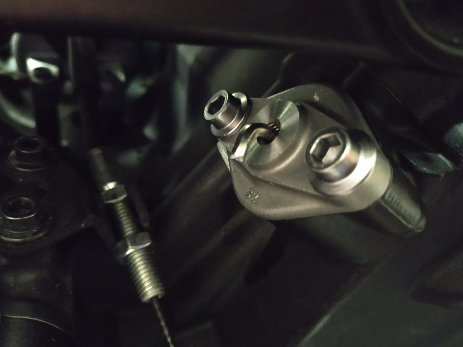 Beide Immbusschrauben M6 entfernen. Geht bescheiden, da Gewindesicherung und kommst schlecht ran. Hab die Schrauben vorher mit Reißnadel markiert , mit Drehmomentschlüssel kommst da nicht ran. 5er Immbus zurechtflexen. Maße: 20mm x80mm ( Bild)