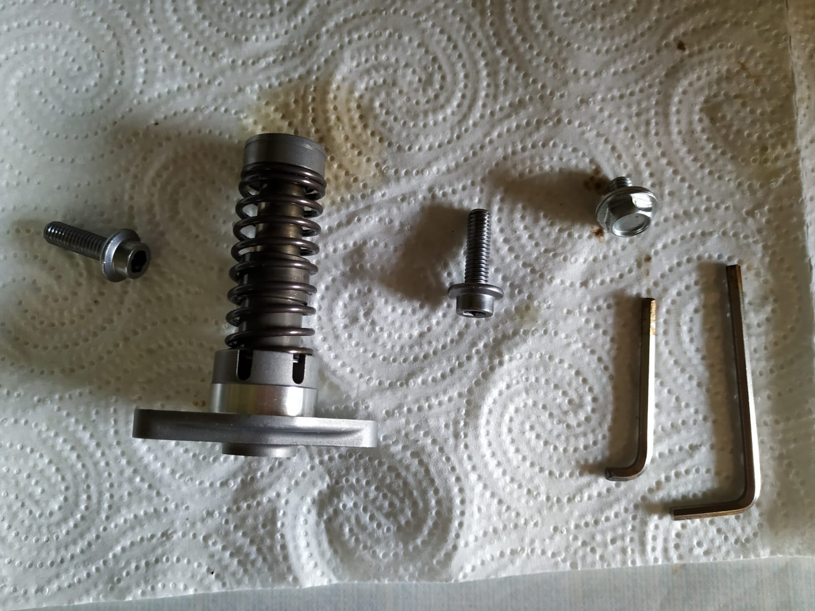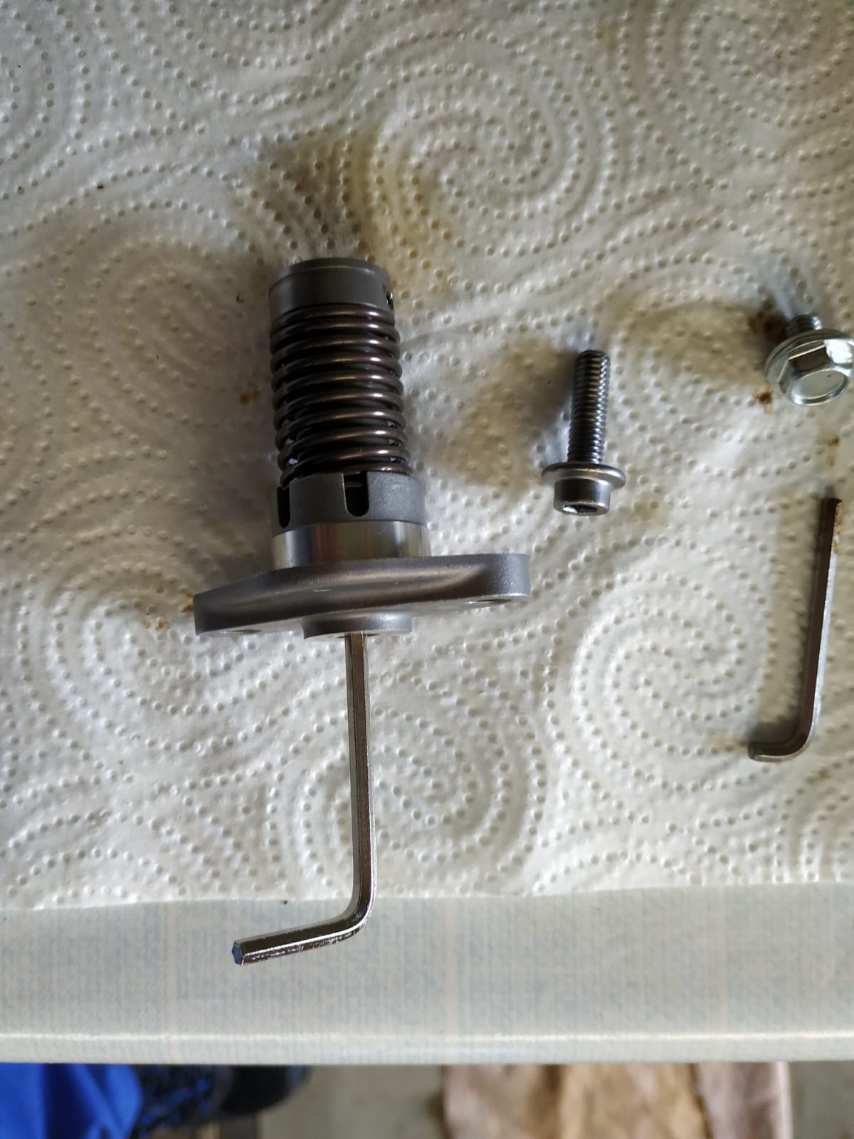 Steuerkettenspanner motieren: Steuerkettenspanner spannen:Steuerkettenspanner mit der Hand zusammendrücken und gleichzeitig mit einem 3er Immbusschlüssel vollständig gegen den Uhrzeigersinn drehen. Steuerkettenspanner gedrückt halten und den Immbusschlüssel gegen den kleine Immbusschlüssel ( Spezialwerkzeug