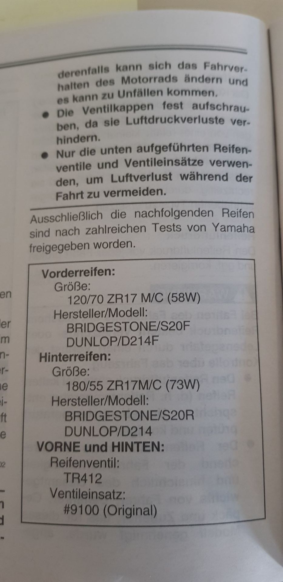 Jetzt sagt mir mein Handbuch, dass nur zwei Reifen von Yamaha "freigegeben" sind!