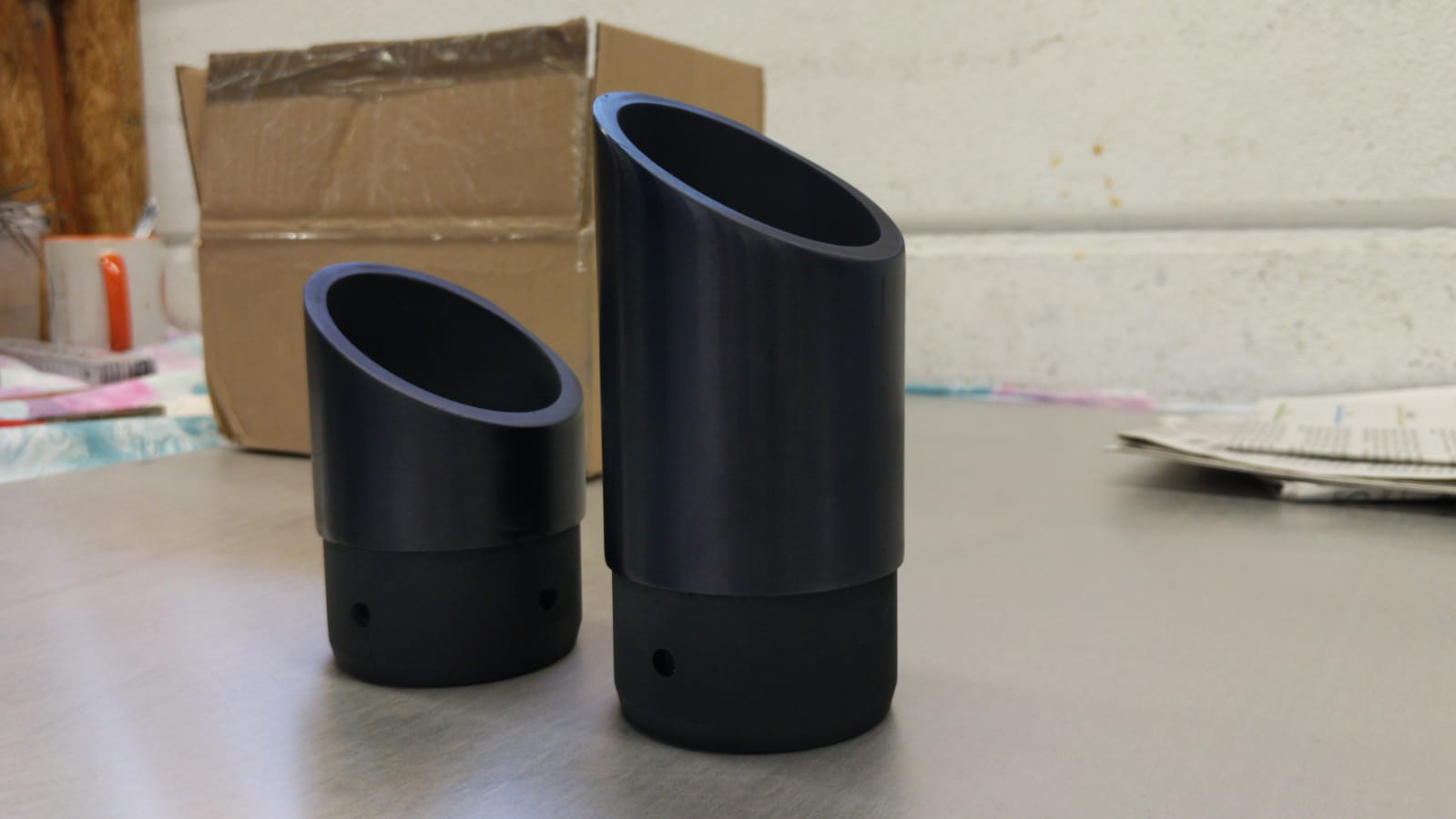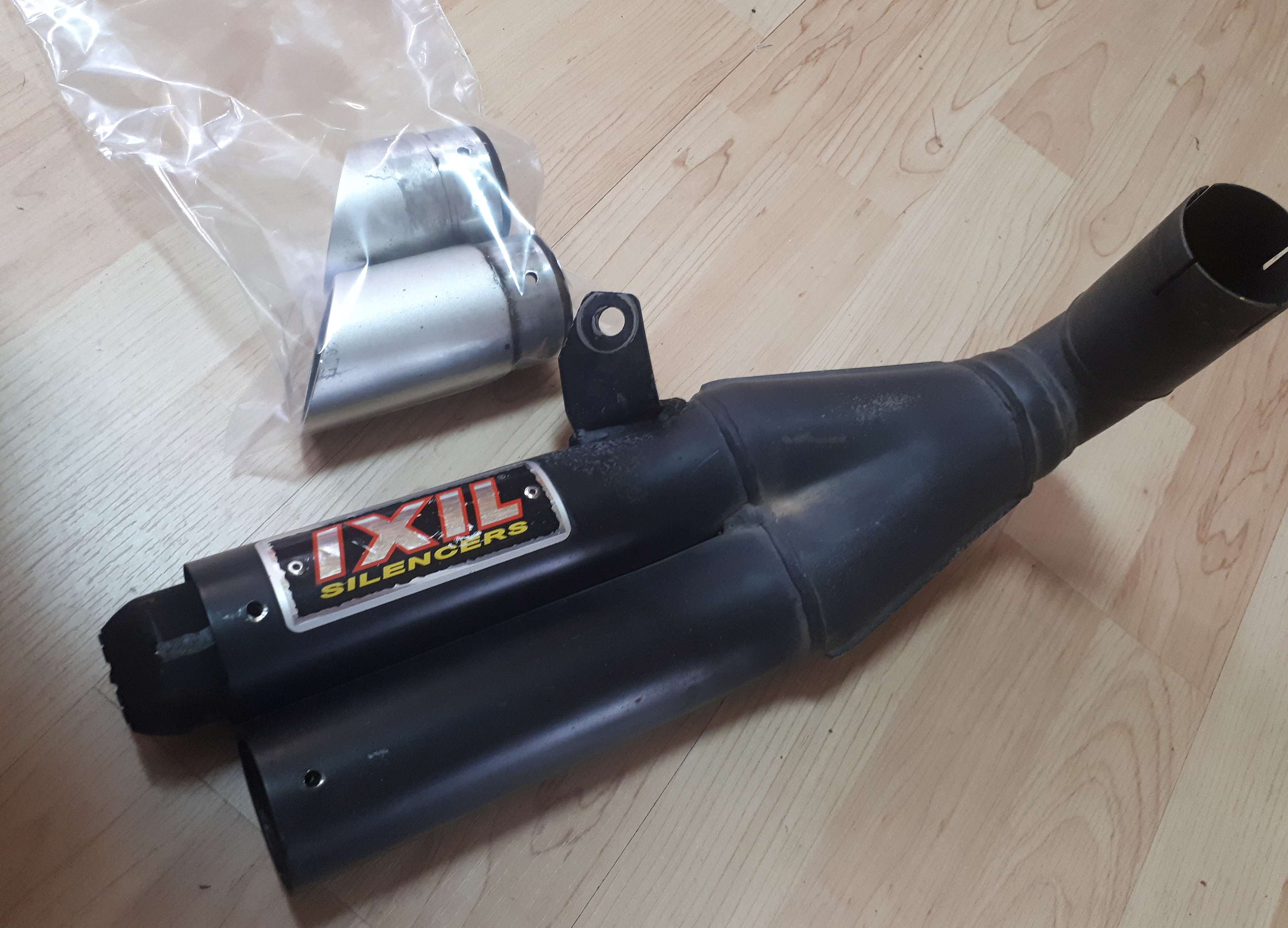 Der gebrauchte Auspuff wird erstmal demontiert und gebeizt, so das der Krümmer wieder schick ist. Die Auspuffblenden wurden abgezogen (silber, Niete aufgebohrt) und zur Galvanikbude geschickt. Sie sollen schwarz eloxiert werden und so besser ins Gesamtkonzept passen