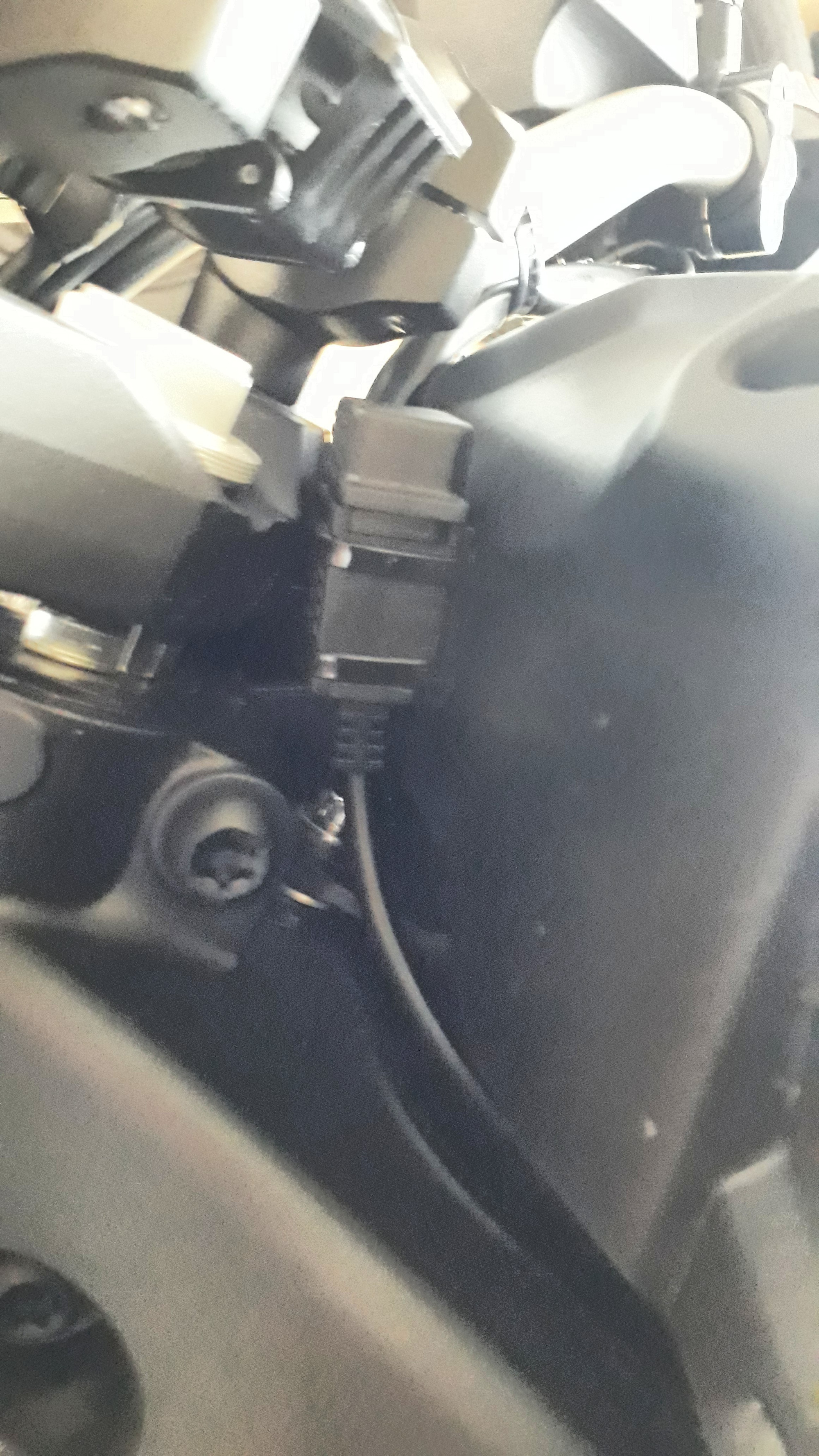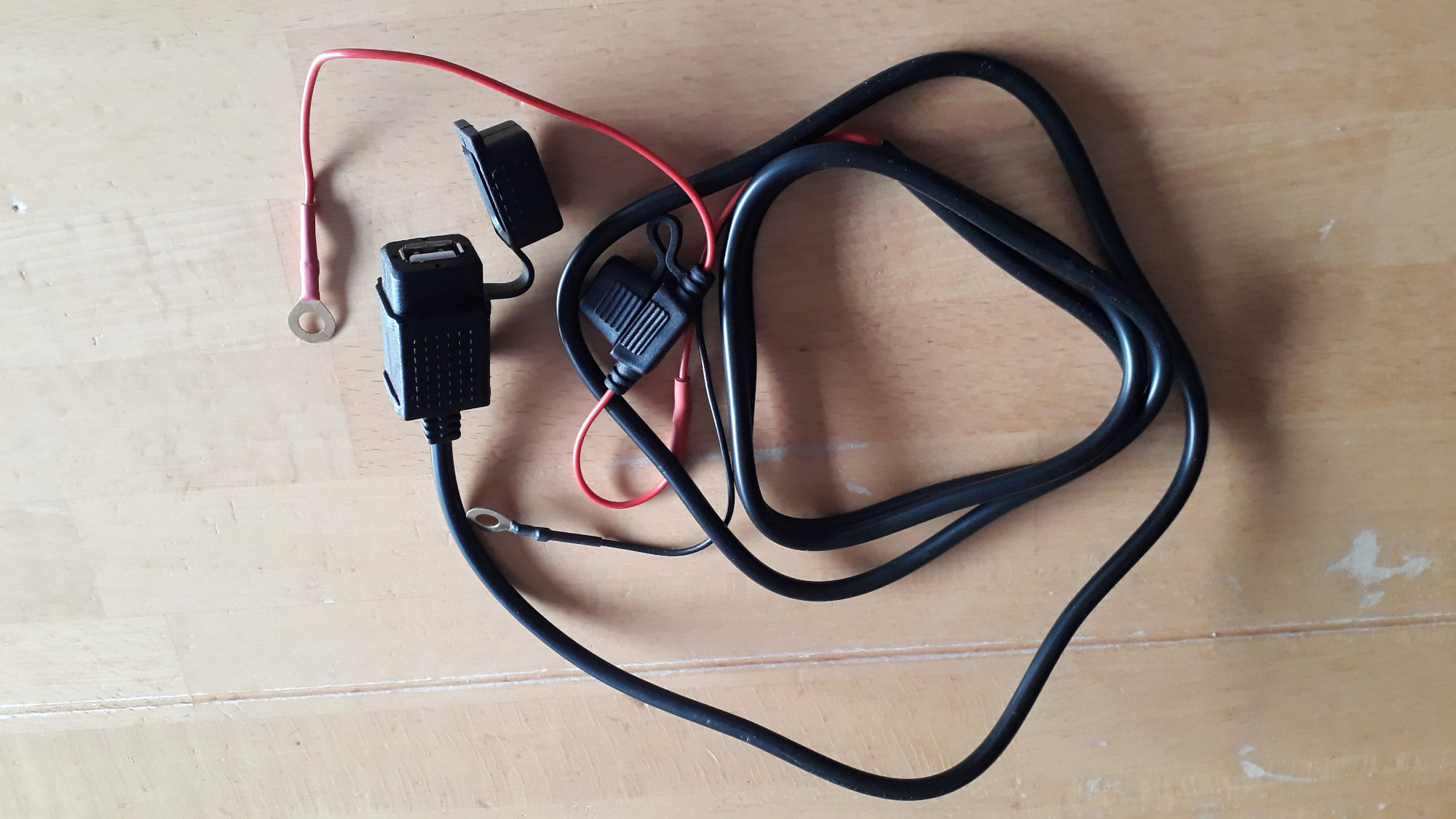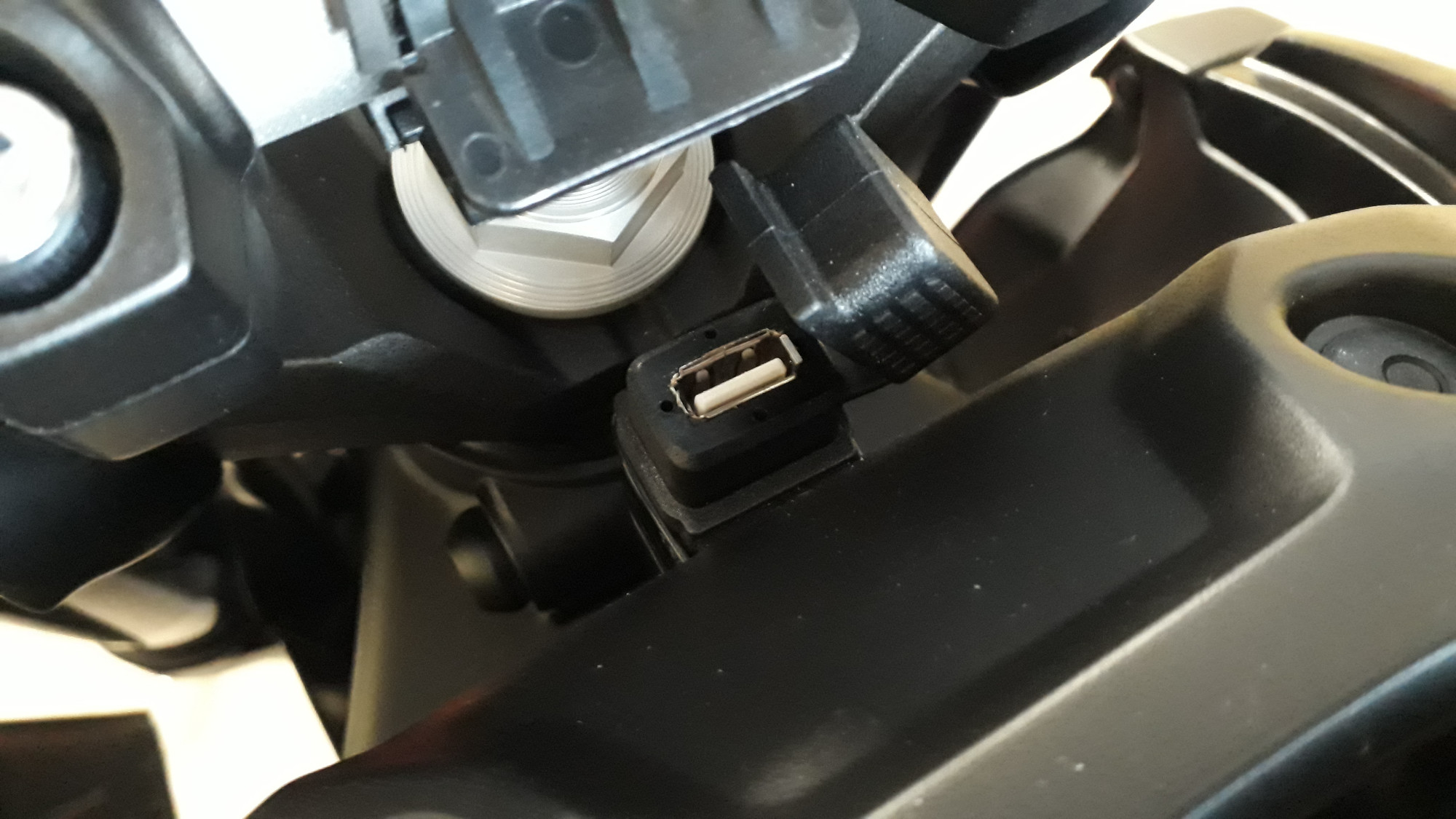 Die USB-Buchse geht haarscharf am Lenkkopf vorbei, passt gerade so. Das Teil liefert angeblich 2,4A, mein Handy lädt mit ca. 1A, genau wie mit dem Original-Ladegerät.