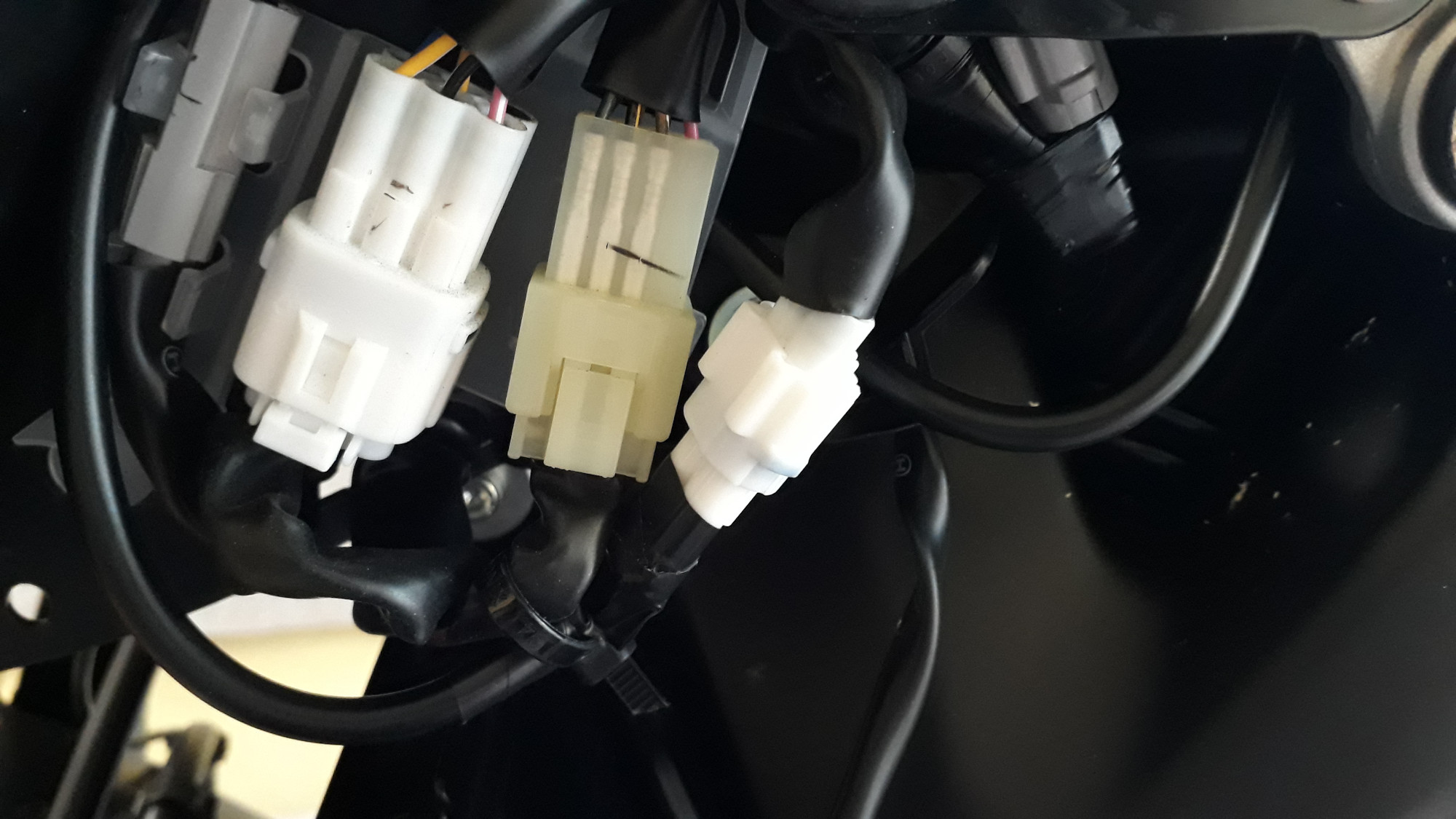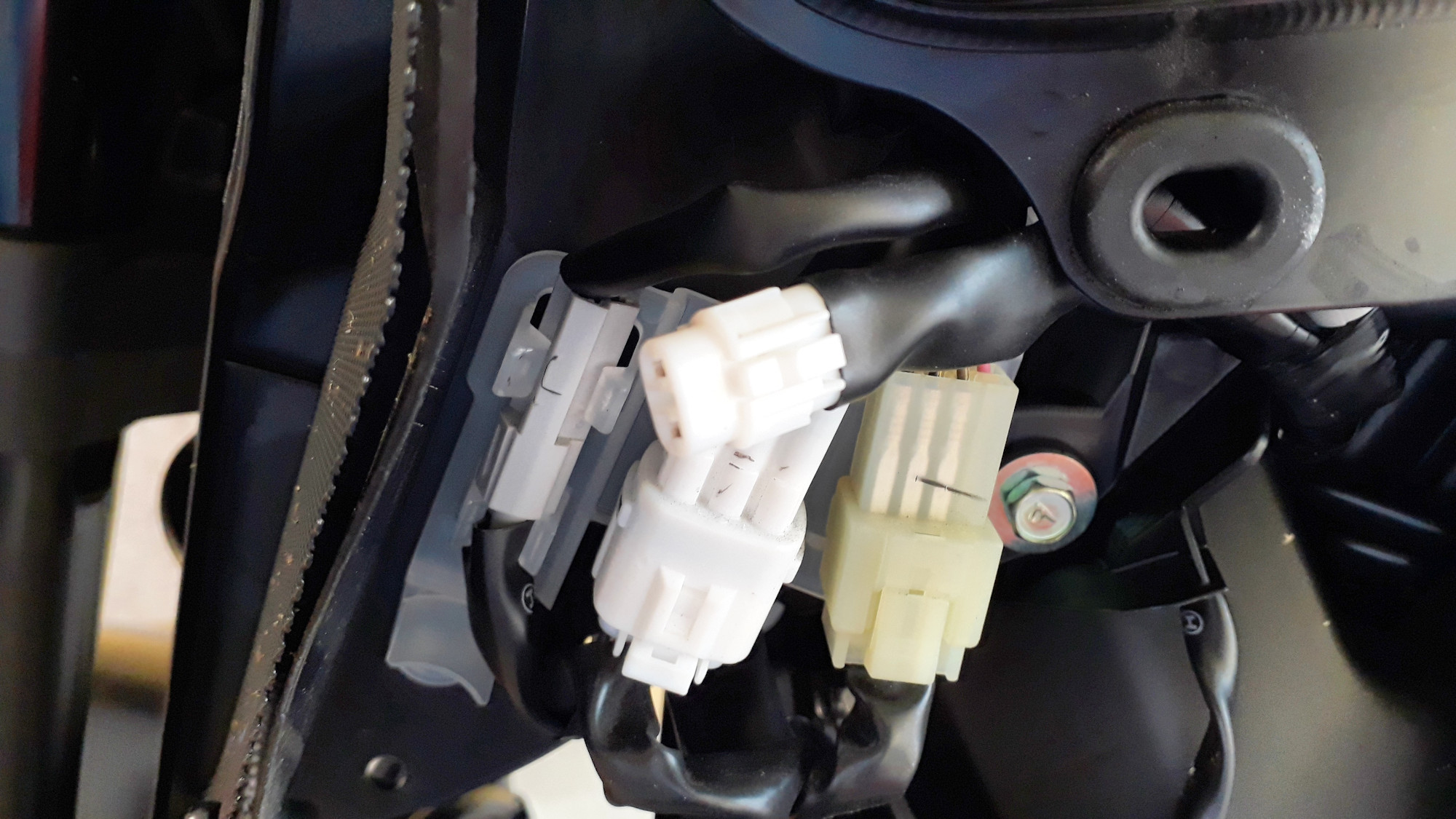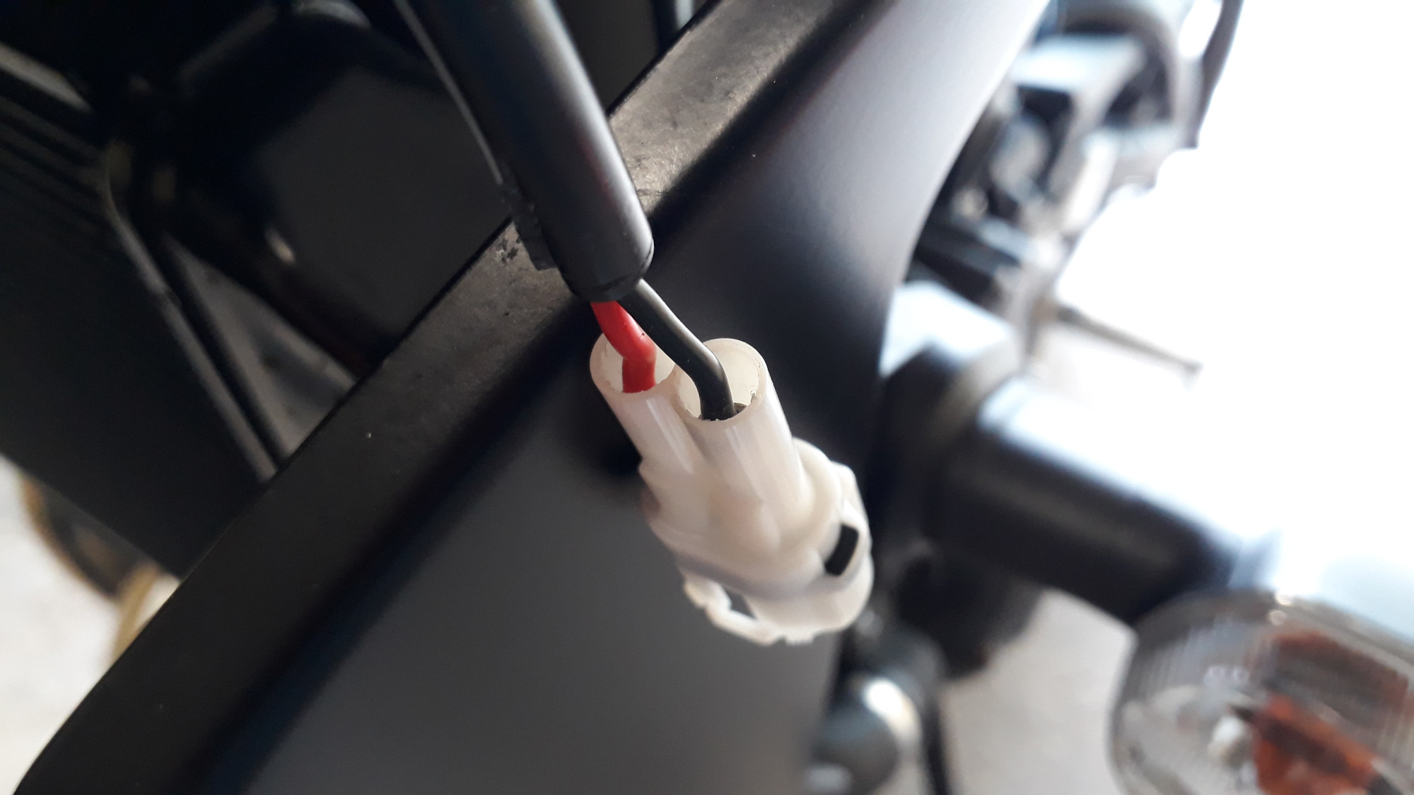 Der Nebenverbrauchsstecker, wo das Ganze angeschlossen wird, befindet sich bei der RN43 auf der linken Seite hinter der Lufthutzen-Atrappe.