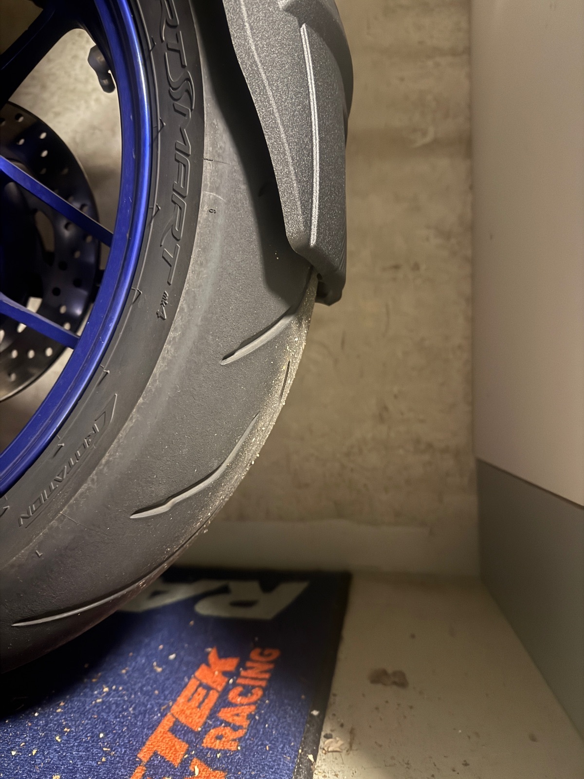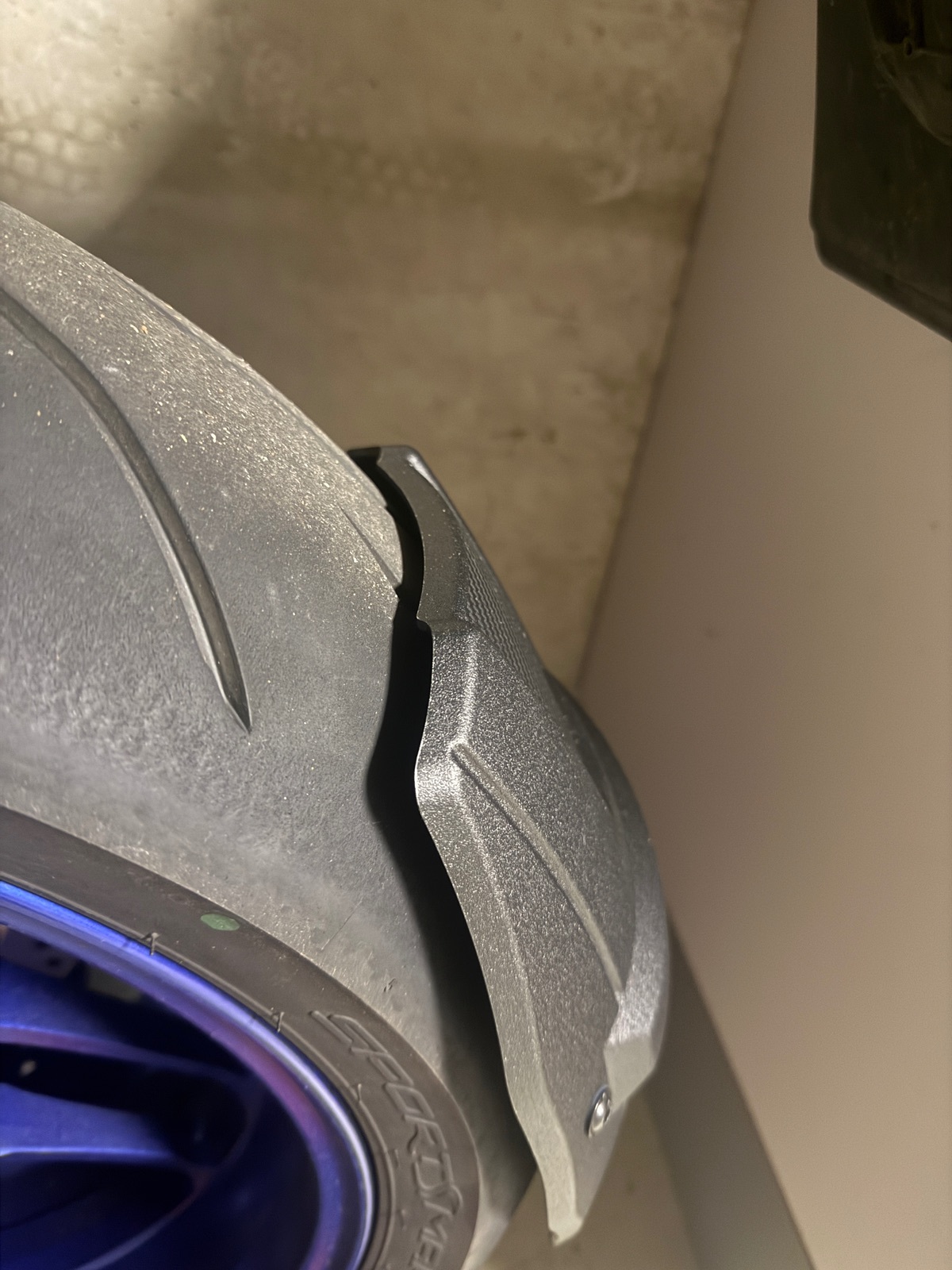 Vielleicht hängt das auch mit der Kontur des Reifens zusammen. Ich fahre den Dunlop MK4 und eventuell ist dessen Kontur eher spitz, denn an den Flanken ist deutlich mehr Abstand.