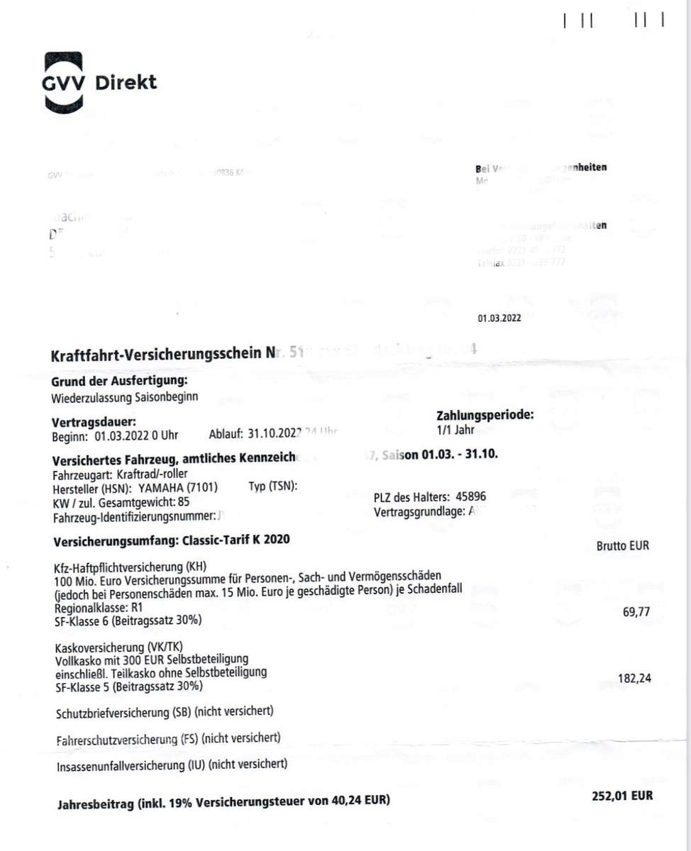 #604 Ich zahle 400,-€ Vollkasko bei einer Namenhaften Versicherung. In den ersten beiden Jahren bekomme ich ein neues Motorrad bei einem Schaden. Es geht wahrscheinlich auch günstiger. Ich habe aber gerne einen Ansprechpartner vor Ort und weiß, dass die Abwicklung im Schadensfall unkompliziert läuft. Versichert von 3 bis 10. RN 69