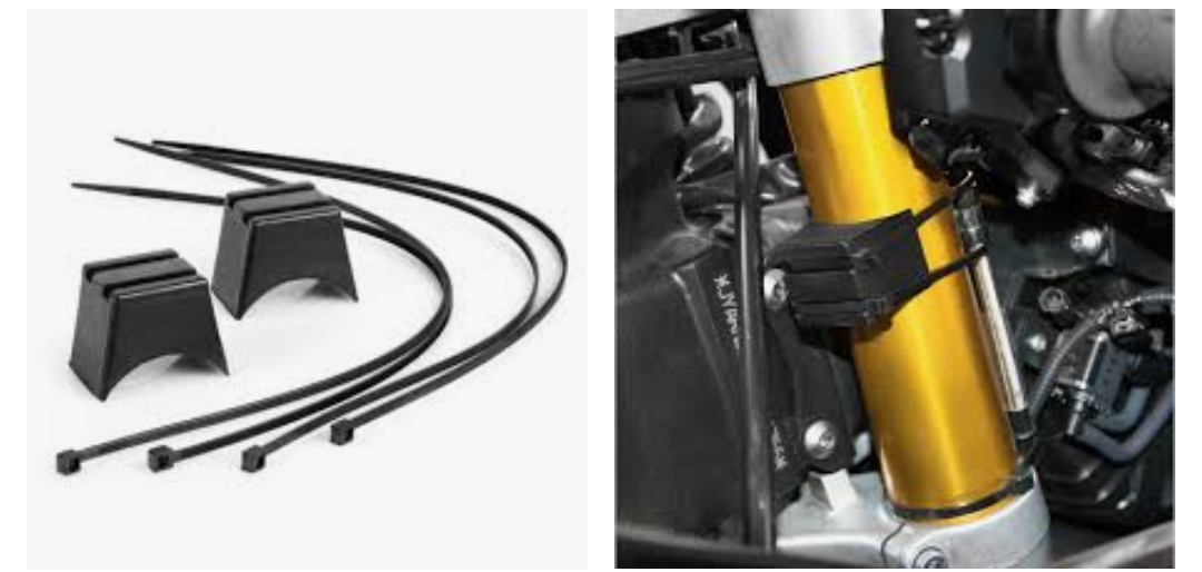 Nun bin ich auf nachrüstbare Lenkeinschlagbegrenzer gestoßen, so ne Art Gummiklötze, die mit Kabelbindern am jeweiligen Gabelbein in der Nähe der unteren Gabelbrücke befestigt werden.