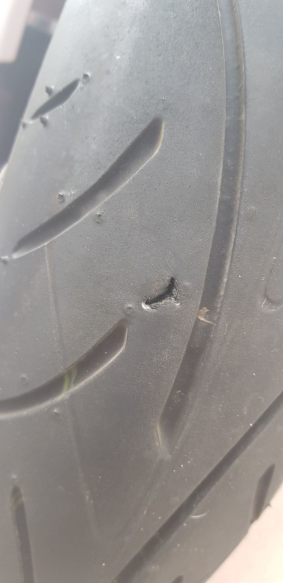 Nach grade einmal 659km hat sich ein Stein drei, vier Millimeter tief in die Lauffläche meines vorderen Reifens gefressen.