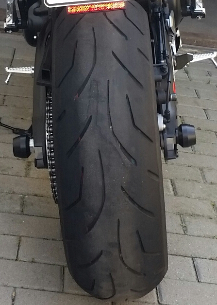 Die neuen Reifen liegen schon hier, nun würde ich aber zu gerne wissen, wieso der hintere Reifen in der überschaubaren Zeit derartig nur mittig abgebaut hat.