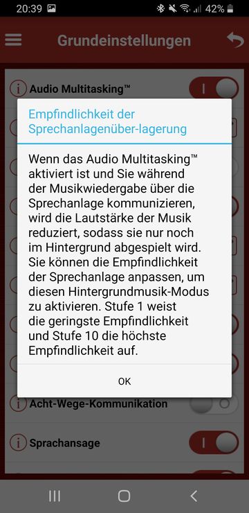 Das Problem das sich mir stellt ist, dass beide beinahe dauerhaft auf Übertragung schalten, sodass ich sie hören kann. Ab Geschwindigkeiten von 60 km/h höre ich bei ihnen sehr sehr leise den Wind säuseln, und auch sehr sehr leise ihre Motorgeräusche beim Beschleunigen. Wenn sie etwas sprechen, ist ein deutlicher Lautstärkeunterschied zu hören. Im Stand und bei langsamen Geschwindigkeiten funktioniert alles einwandfrei. Klar, ab 100 km/h übertönt mein Fahrtwind das Rauschen meiner Lautsprecher, aber es ist so oder so keine Lösung, ständig meine Lautstärke anzupassen.