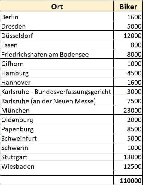 Ich finde es toll dass Ihr mitgemacht habt. Keine Sorge.....auch Politiker sehen die Massen von Motorrädern. Denn auch in der Politik sind sich nicht alle einig. Und schaut mal nach Tirol. In der ersten Woche viele Kontrollen und jetzt berichten Biker, dass sie während Tagen kein Polizeiauto gesehen haben. Ich meine.....hallo? Wenn man plötzlich eine Minderheit für den Lärm in der Atmosphäre verantwortlich macht aber gleichzeitig ganze Regionen vom Tourismus, der Produktion und dem Verkauf leben, so ist das ein Knieschuss. Diese Rechnung kann gar nicht aufgehen und ist eine grobe Verschwendung von Steuergeldern. Und wenn ein dB-Wert gelten soll, dann bitte für alle Vehikel - denn 95 dB sind 95 dB - egal ob Panigale oder AMG. Ich gratuliere jedem Biker der mitgefahren ist und ich hoffe, dass Ihr in Deutschland mehr Erfolg habt als die Tiroler. Gruss mit links aus der Schweiz!![]()