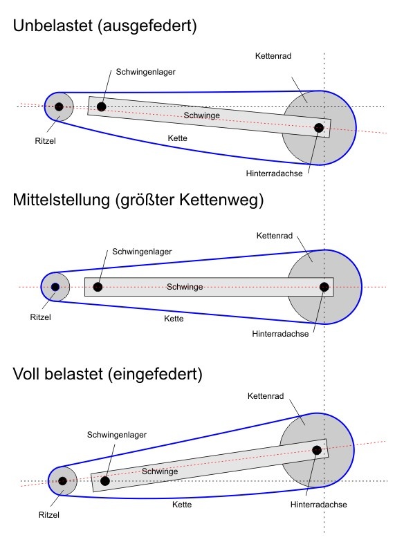 Die Kette ist am meisten gespannt, wenn Abtriebswelle - Schwingenachse und hintere Radachse genau auf einer Linie liegen. Nur dann ist der Abstand Abtriebswelle - Hinterradachse am größten.