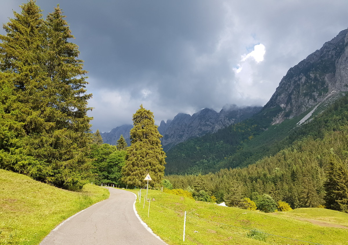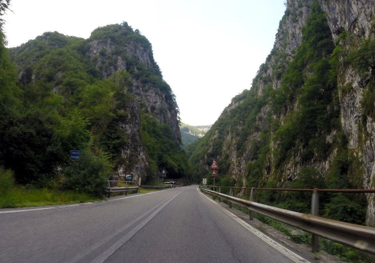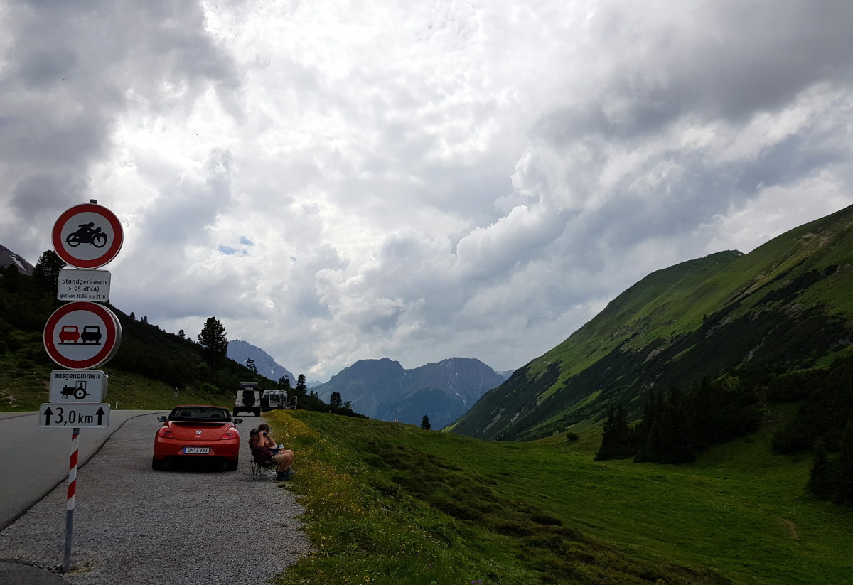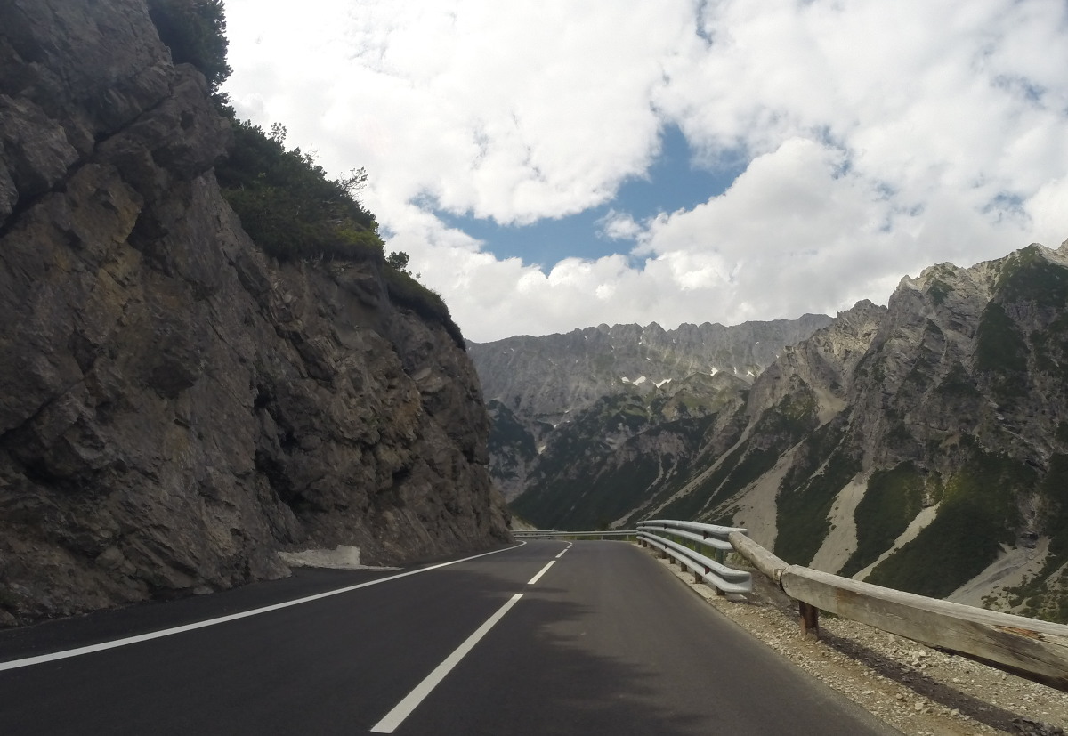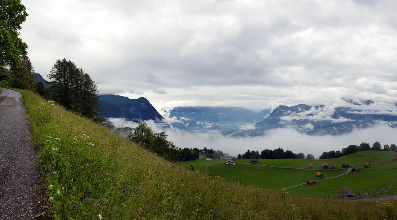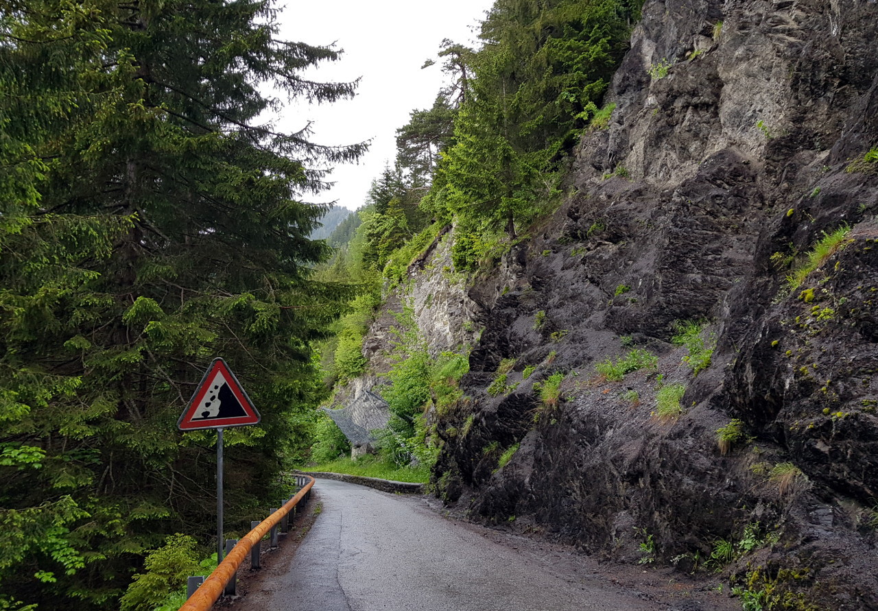 6 Uhr aufstehen, 7 Uhr Abfahrt. Es geht durchs Engadin. Es sind Schauer angesagt für den Schweizer Teil der Route und Sonnenschein für den italienischen. Es geht ohne Mautstrecken südlich im ländlichen Berufsverkehr, schön anständig, wir sind hier in der Schweiz. Der erste Wegpunkt liegt in Liechtenstein, der alte Tunnel. Wegen einer Baustelle geht's eigentlich nicht weiter, aber man fährt einfach dort rein, wo andauernd Autos rauskommen. Merkwürdigerweise müssen auch im Finanzdienstleisterparadies Liechtenstein manche Leute morgens zur Arbeit fahren. Es ist regnerisch und recht feucht, aber man hat echt schöne Landschaften.