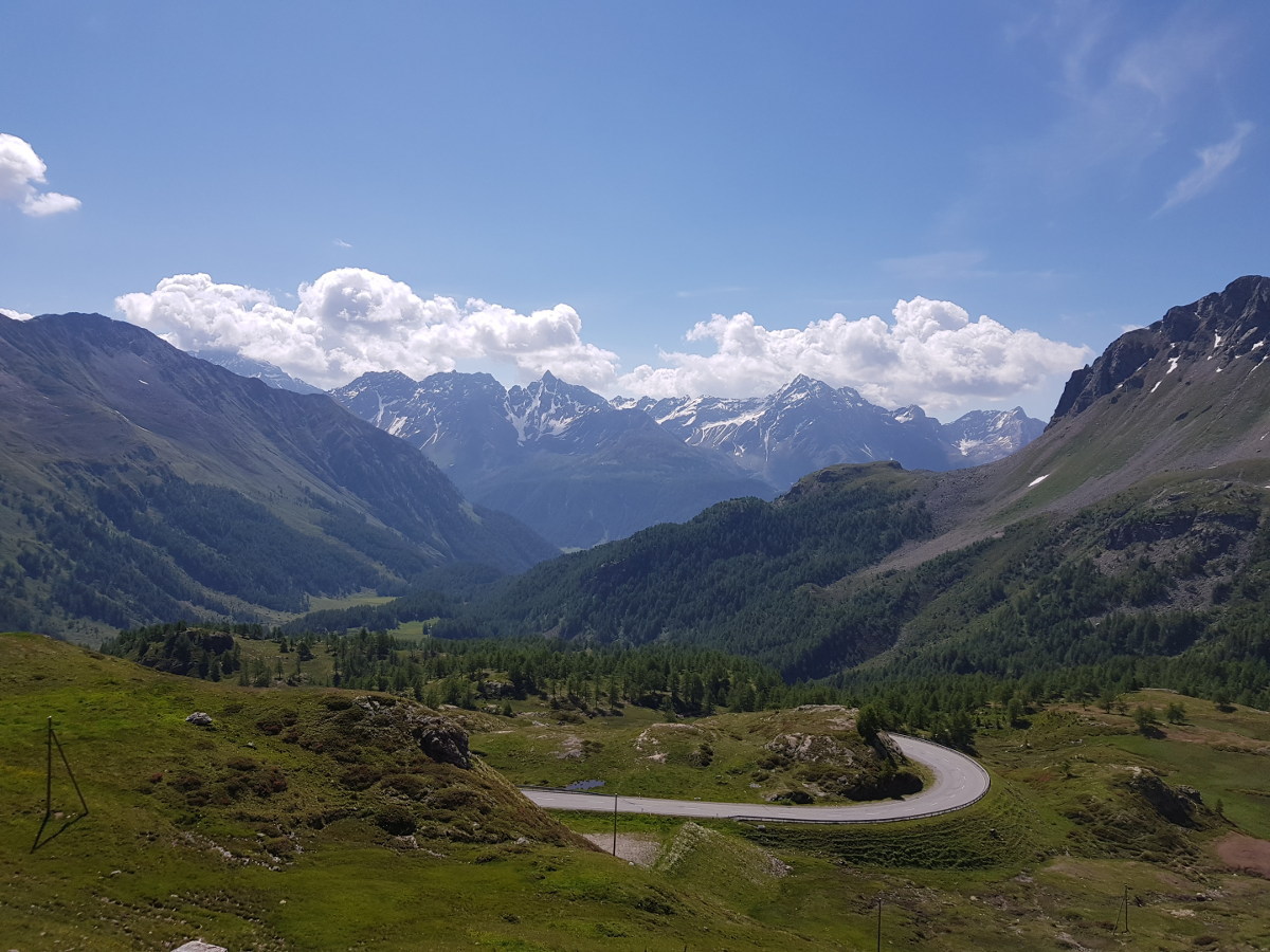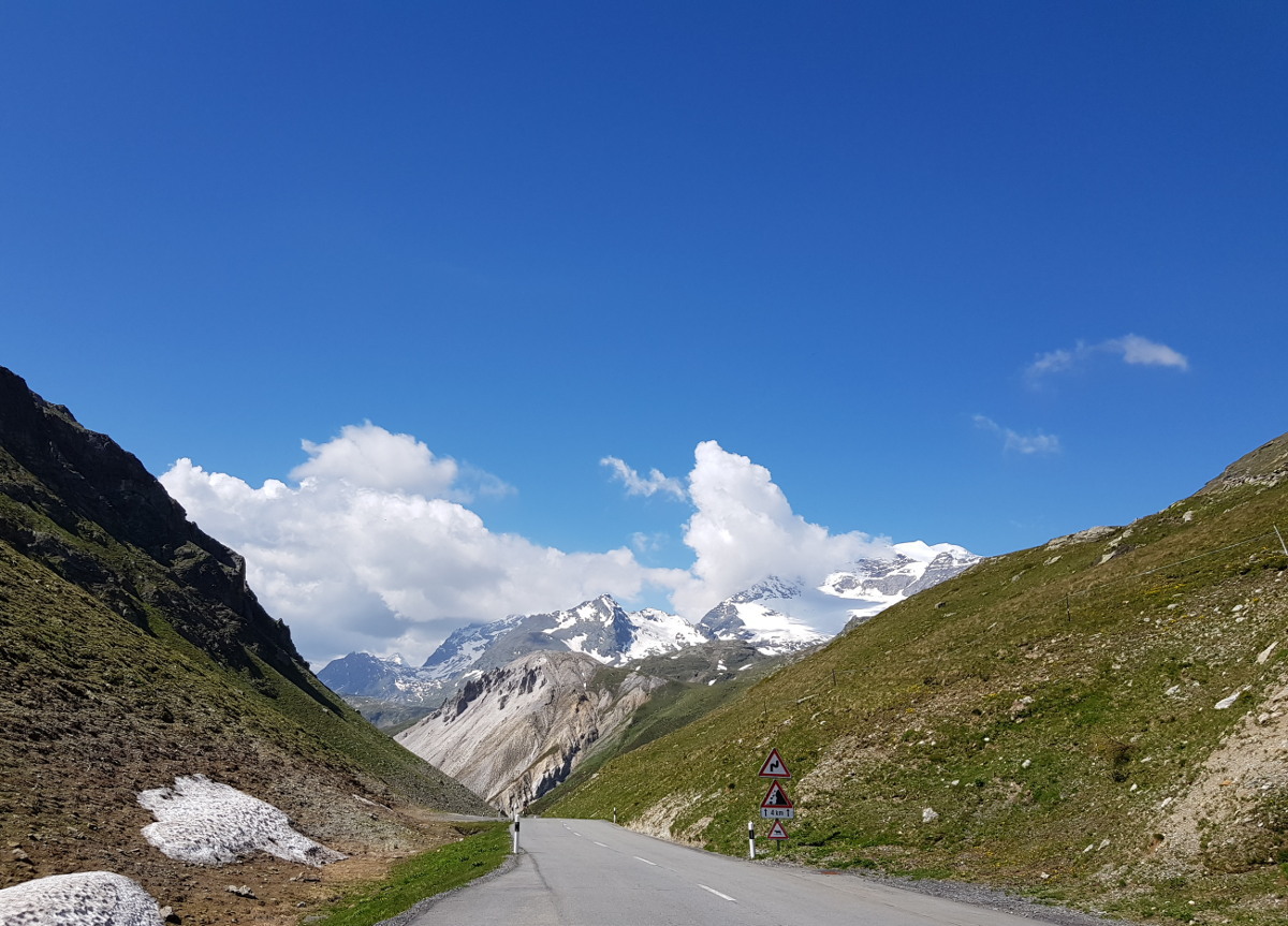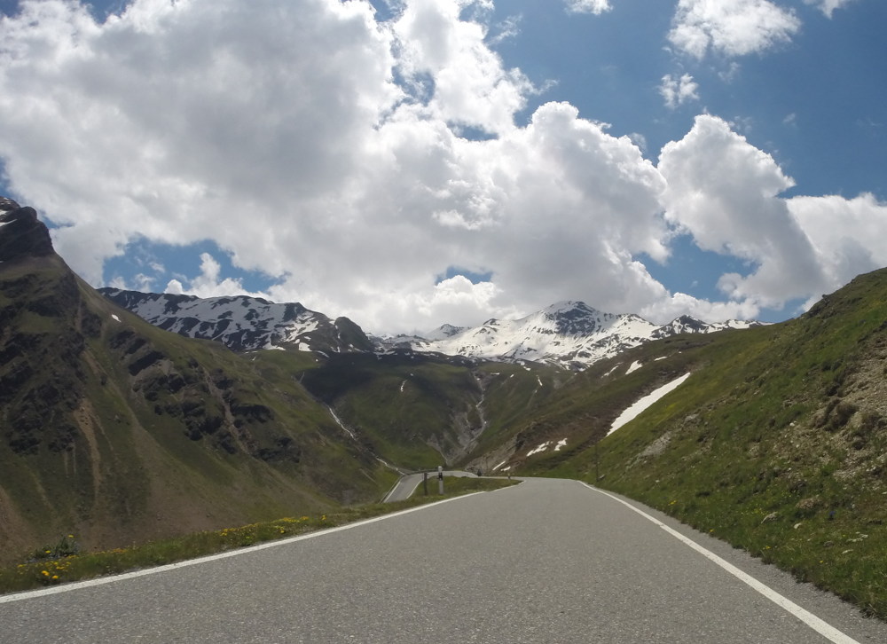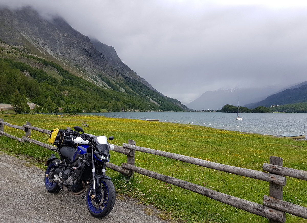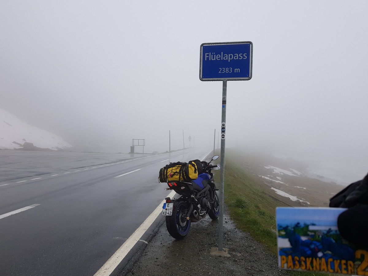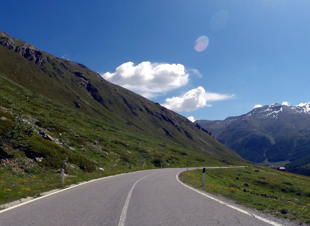 Dann geht's östlich in die Alpen rein. Hier findet man zügig Höhenmeter, und büßt dafür bei der Temperaturanzeige. Da werden aus 10° dann schnell mal 4°. Dass der Reißverschluss meiner alten Regenjacke – die mit dem günstigeren Packmaß - nicht ganz funktioniert, hilft nicht wirklich. Meine Route deckt sich ziemlich mit der "Grand Tour" und verläuft entlang des Engadiner Hochtals, mit Abstechern zu den Umliegenden Pässe.