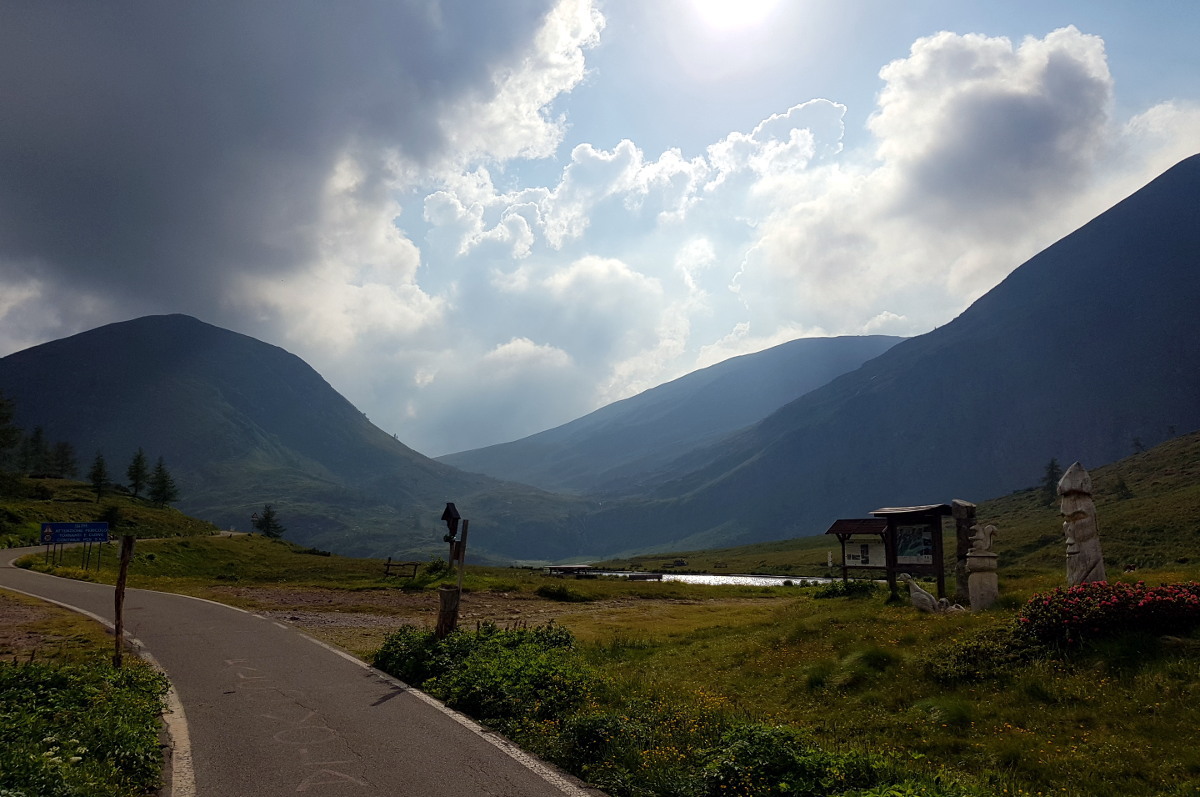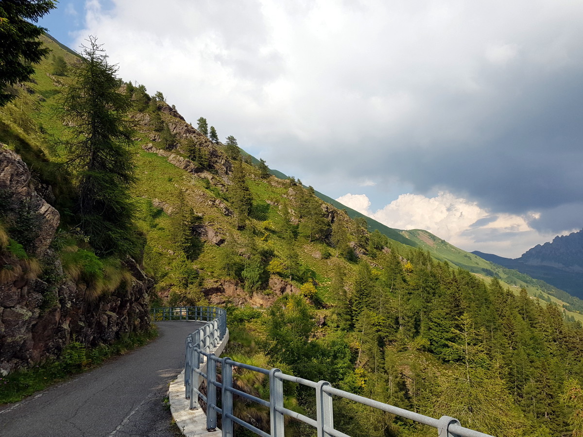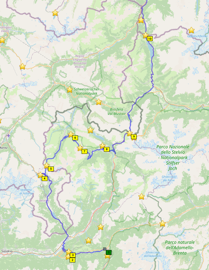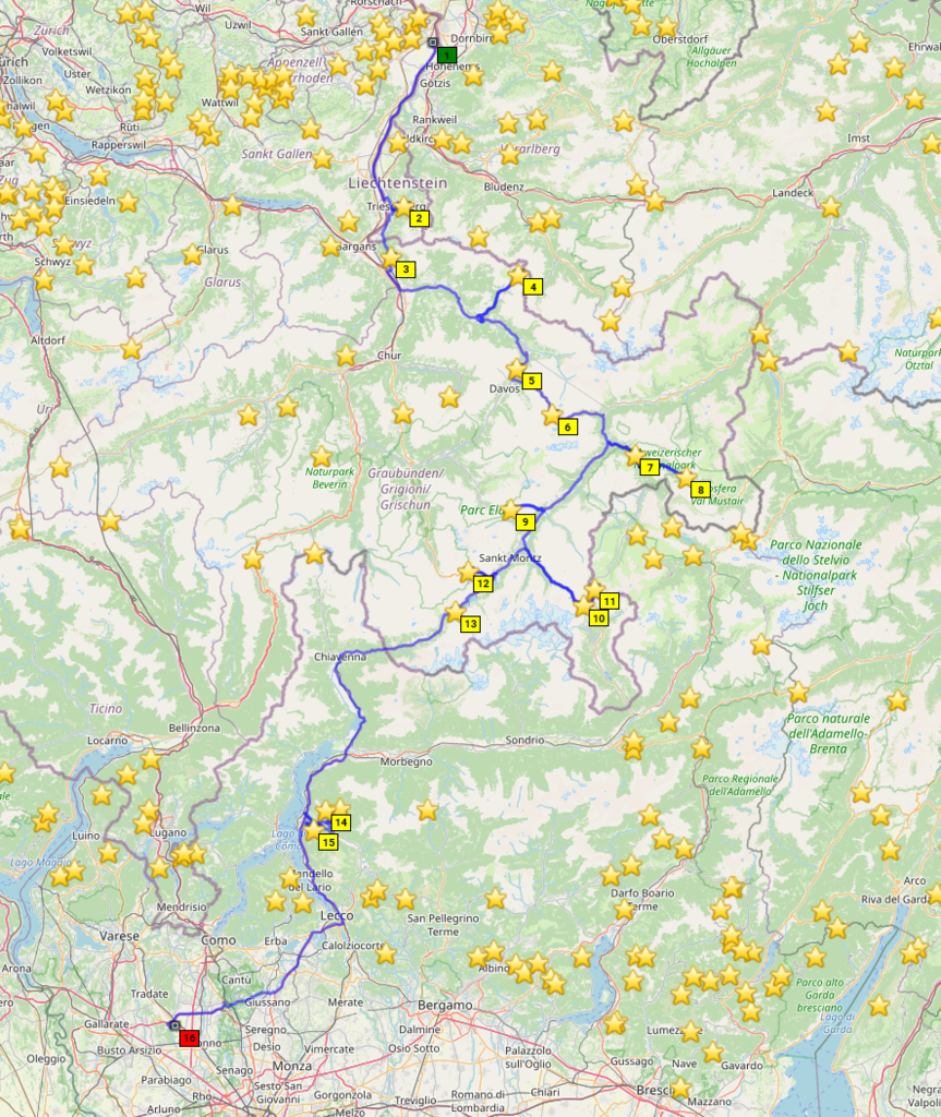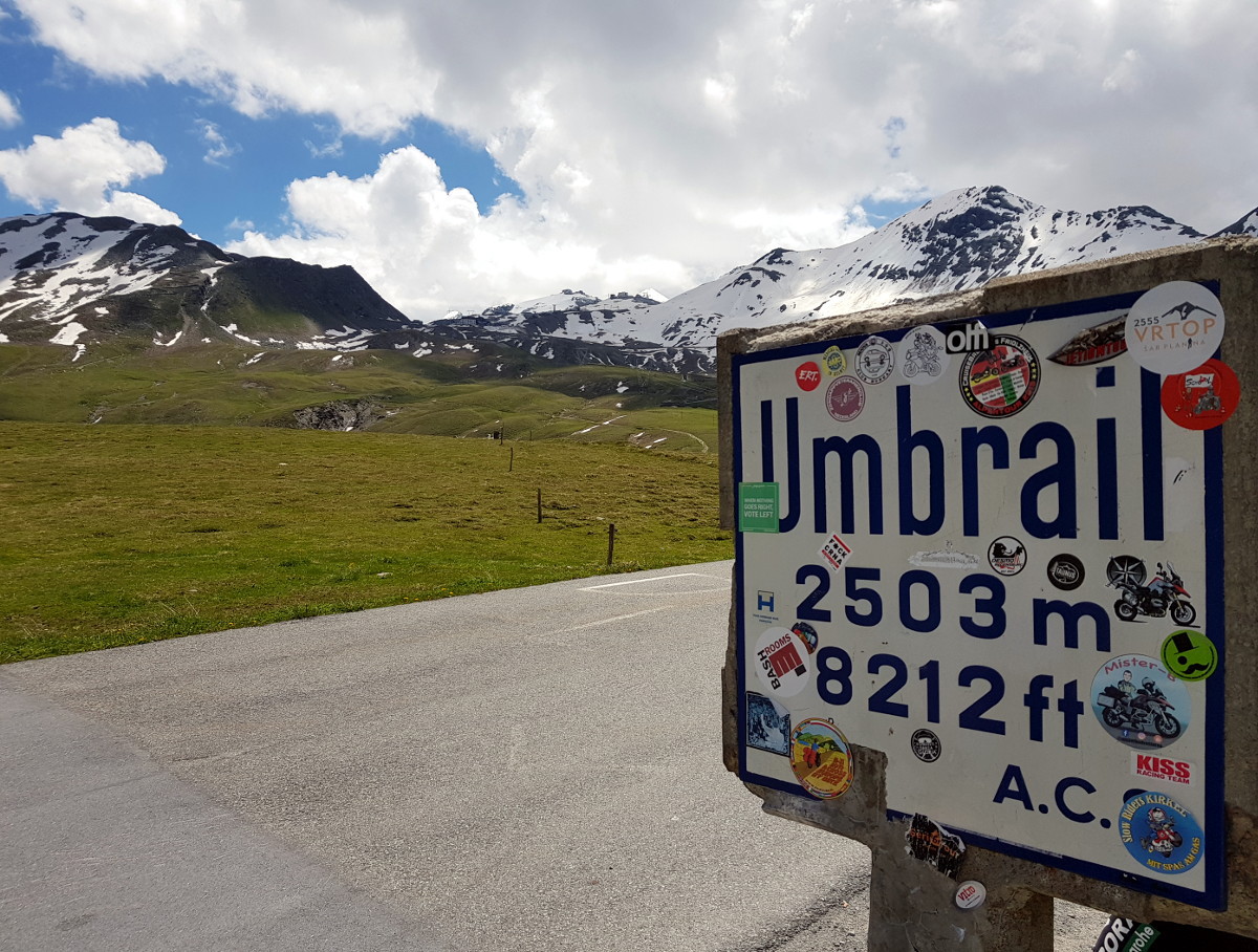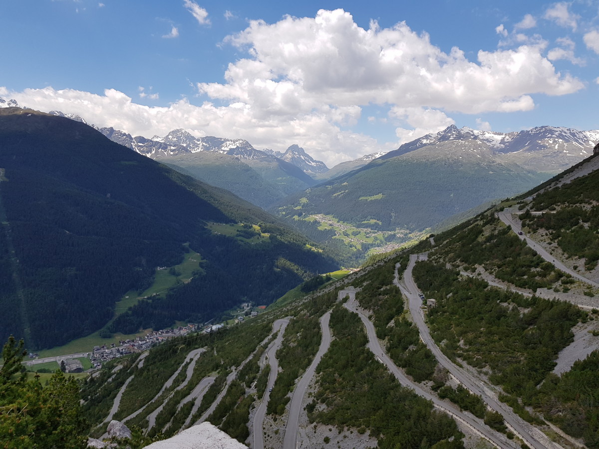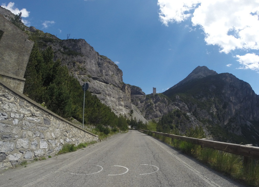 Dann geht's östlich in die Alpen rein. Hier findet man zügig Höhenmeter, und büßt dafür bei der Temperaturanzeige. Da werden aus 10° dann schnell mal 4°. Dass der Reißverschluss meiner alten Regenjacke – die mit dem günstigeren Packmaß - nicht ganz funktioniert, hilft nicht wirklich. Meine Route deckt sich ziemlich mit der "Grand Tour" und verläuft entlang des Engadiner Hochtals, mit Abstechern zu den Umliegenden Pässe.