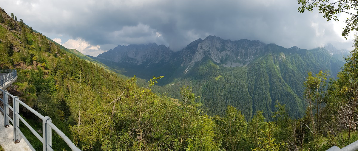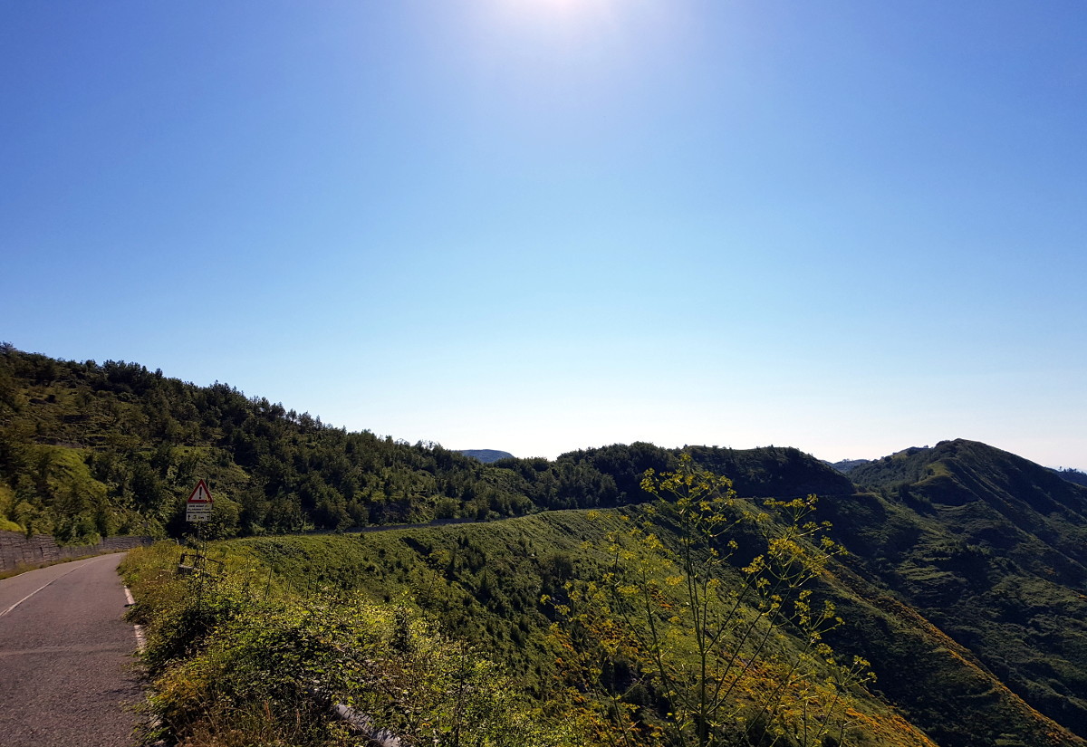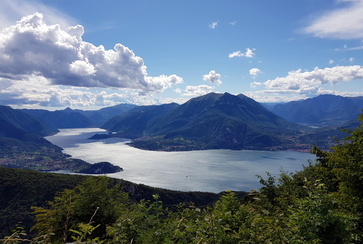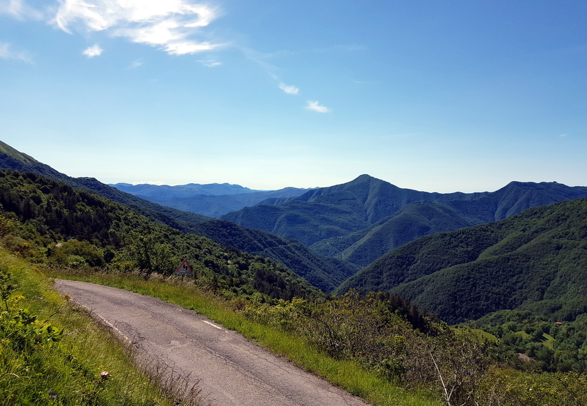 Kaum ist man in Italien, scheint die Sonne. Und dann geht's auch schon in die diversen vierspurigen Tunnel, den Comer See entlang. Ein eiliger Einheimischer führt mich sicher durch den Schilderwald. Das geht mir fast zu schnell, Anfunktszeit 16:00, und so biege ich ab zur Alpe Guimello. Dahin führen diverse Bergstraßen 1. bis 3. Ordnung. Noch schicker wird's am Passo Agueglio, denn dort hat man Sicht auf den Comer See.