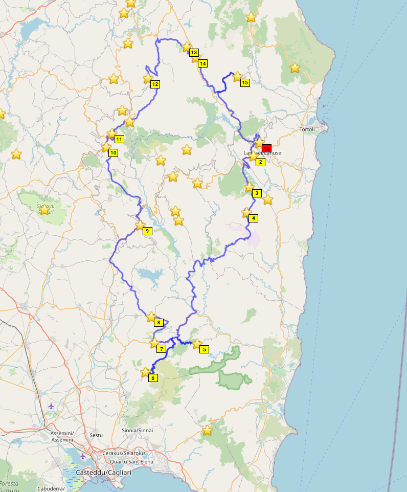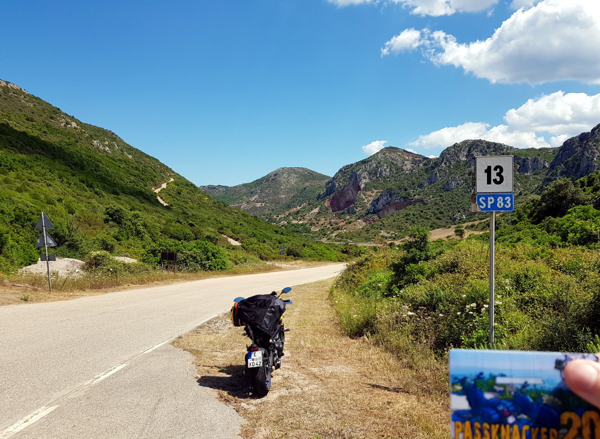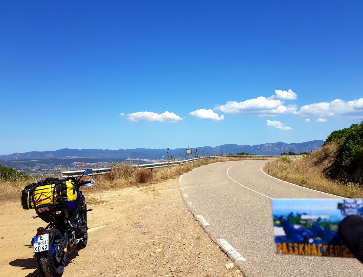 Sardinien! Liegt da im Mittelmeer rum und ich war noch nie da, dabei habe ich seit 14 Jahren einen Motorradführerschein. Ein unhaltbarer Zustand! Die Eckpunkte der Reiseplanung ergeben sich schnell. Ich will den Passknacker Landespreis in Sardinien, also alle 65 Passknackerpunkte in Sardinien besuchen, das sind Höhenübergänge und hohe Sackgassen. Die Routenplanung ergibt 6 Fahrtage in Sardinien mit 2 Basislagern (Fewo Elini im Osten und BNB Ozieri im Norden). Ich nehme mein eigenes Motorrad, statt zu fliegen und zu mieten. Beide Fähren wähle nachts, und den nördlichsten Hafen in Italien (Genua). Ich plane je 2 Tage für An- und Abreise auf Achse über "schön", schließlich habe ich Urlaubstage extra, keine Anhängerkupplung am Auto, und mein Auto frisst auch mehr Sprit als zwei Motorräder zusammen. Achso, die Grundidee ist wieder mal 1. Motorrad fahren, 2. Motorrad fahren und 3. MOTORRAD FAHREN!! Kultur, Kulinarik und Badespaß sind was für eine andere Gelegenheit. Unterkünfte so günstig wie möglich mit eigenem Bad und gewissen hygienischen Ansprüchen. Fähren mit Kabine.