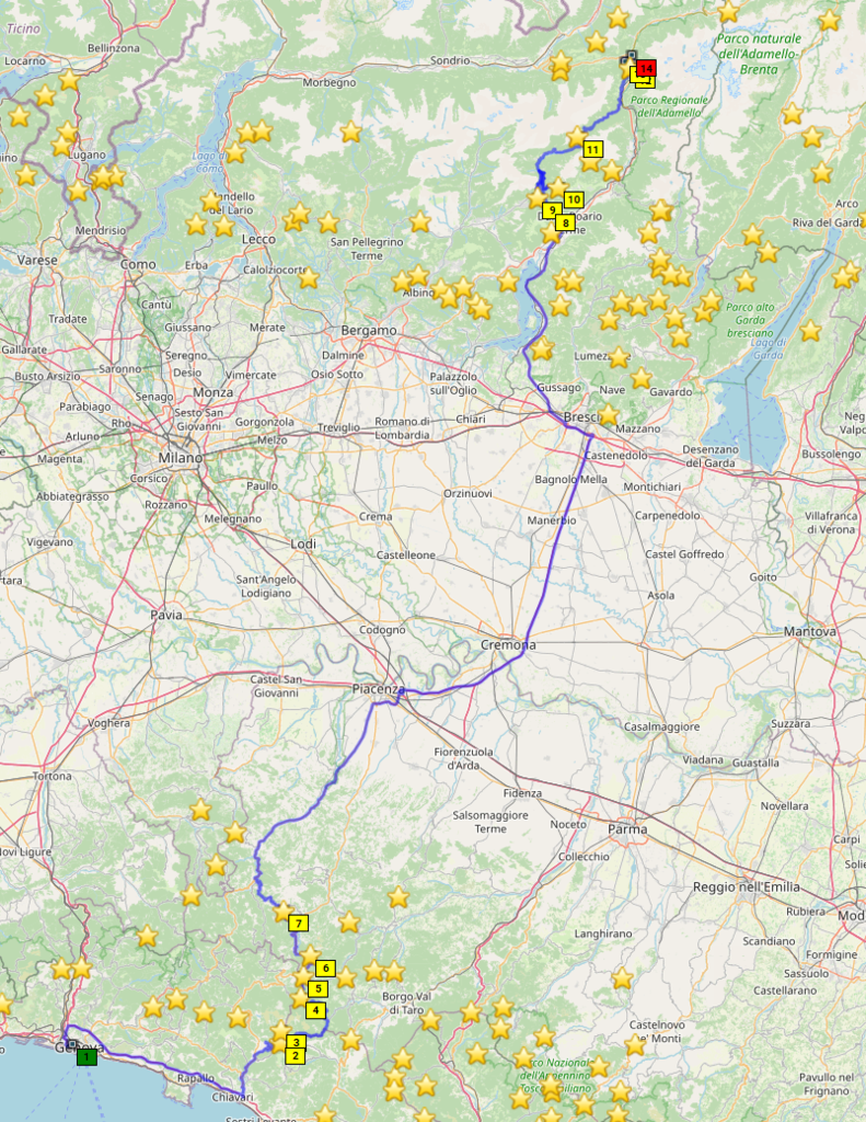 Mein BNB in Cislago ist optisch von außen wieder Bruchbude, und es ist niemand da, um mich rein zu lassen. Also anrufen, warten, und nochmal anrufen, und dann kommt jemand, aber ich kann kein italienisch. Mit Händen und Füßen finden wir mein Zimmer, aber der Wifi-Schlüssel bleibt in Dunkeln. Das klärt eine SMS. Innen ist die Bude modernisiert und schön groß (4 Betten in zwei Zimmern, ebenerdige Dusche). Das passt!
