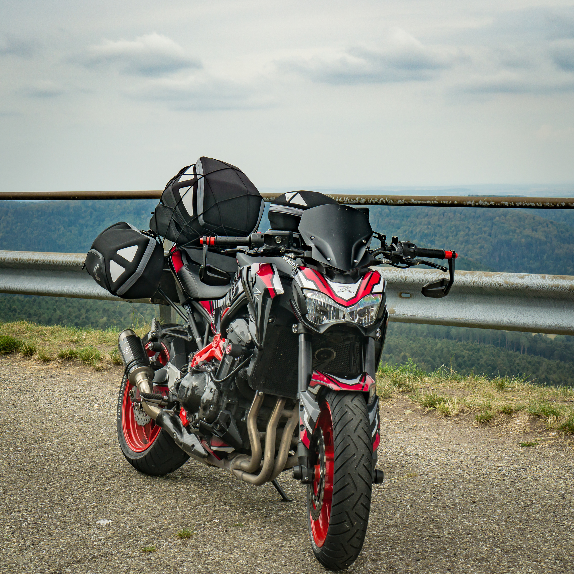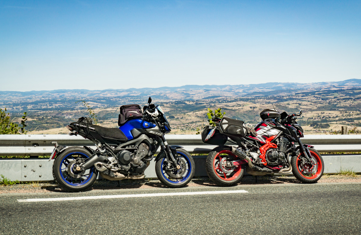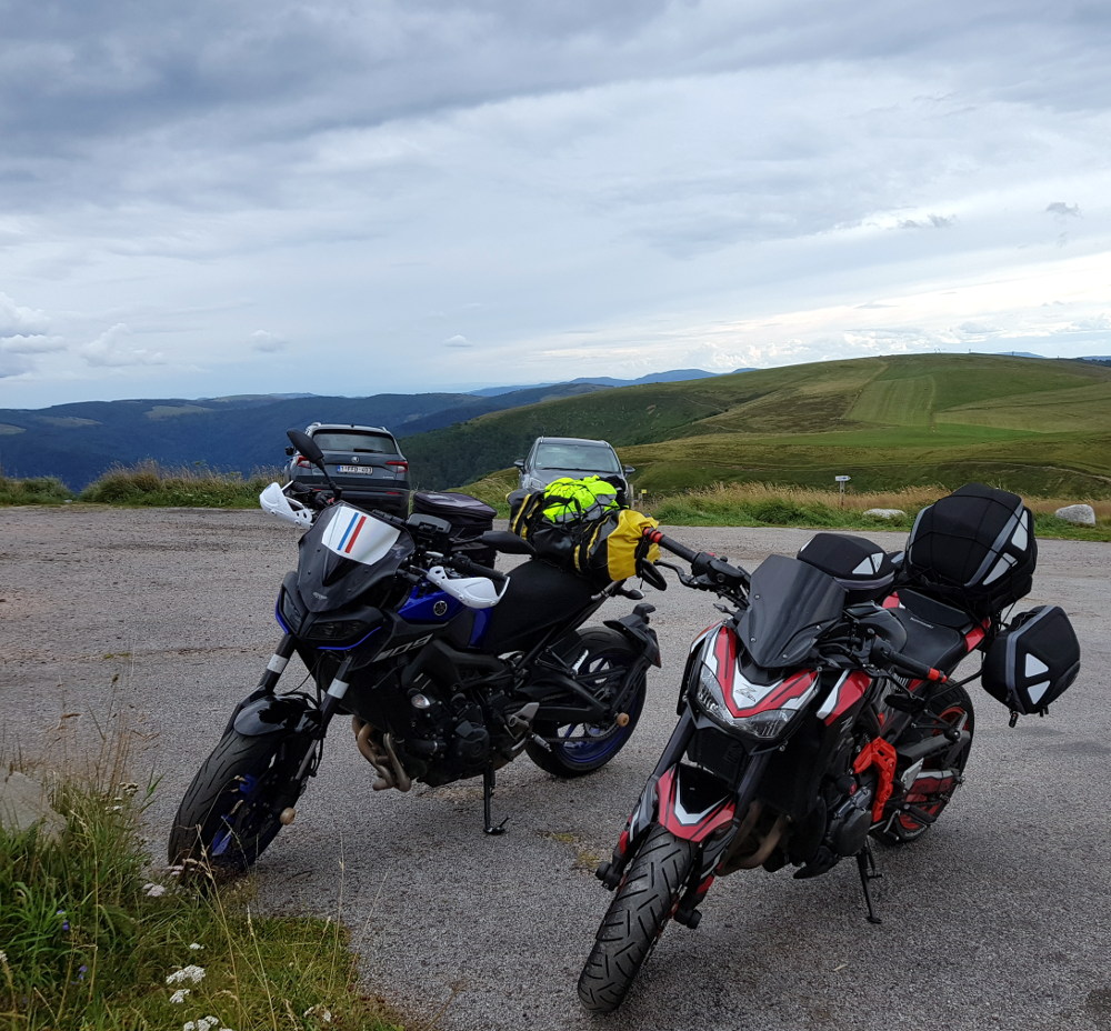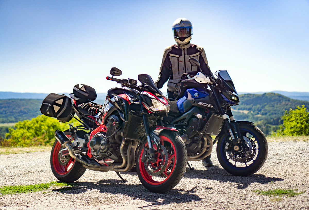 Das Problem: Wir wohnen 450 km voneinander entfernt (Wuppertal, Nürnberg) und wollen auf unseren sexy Naked Bikes (MT-09, Z900) nicht ständig Gepäck umherfahren und nicht jeden Tag ein- und auspacken.