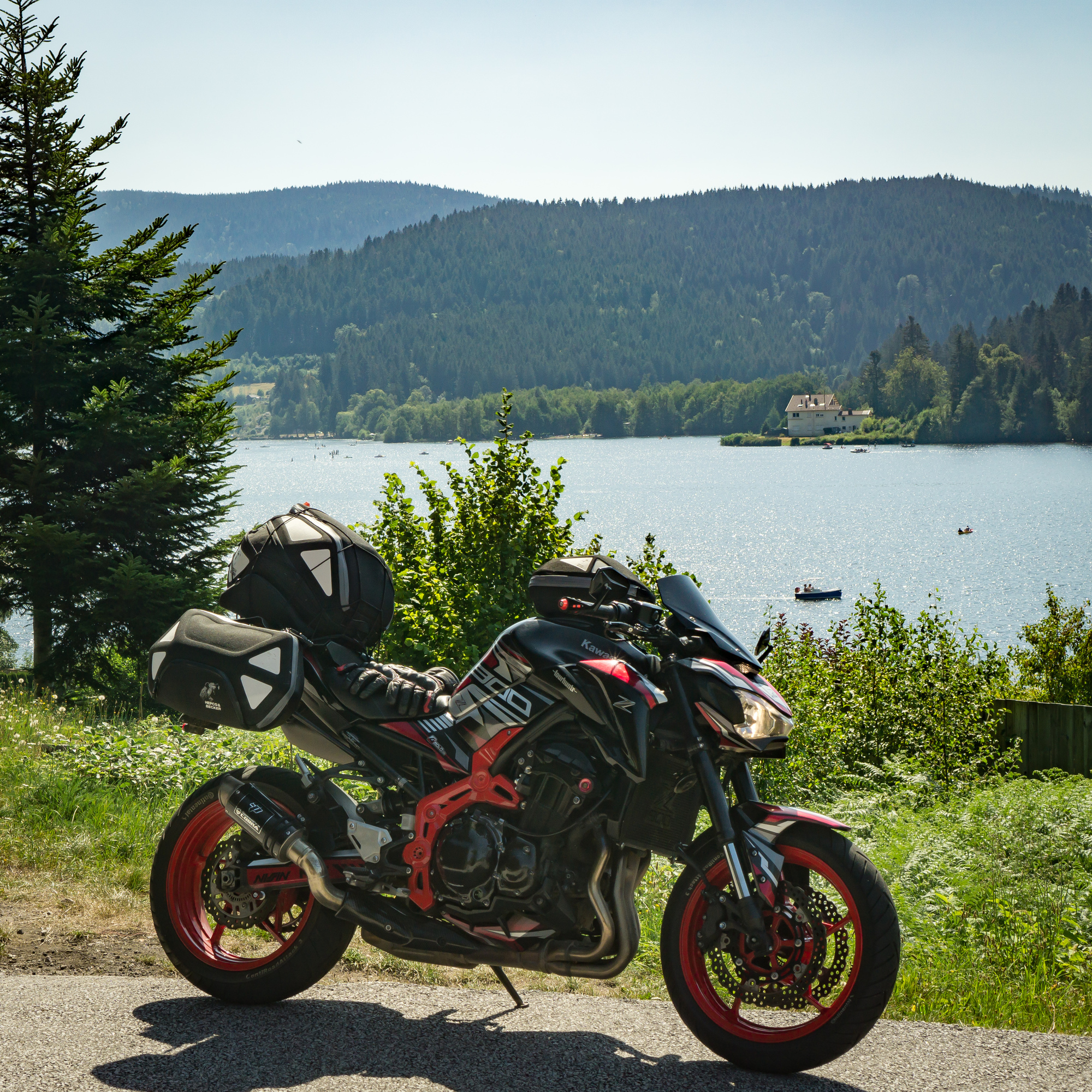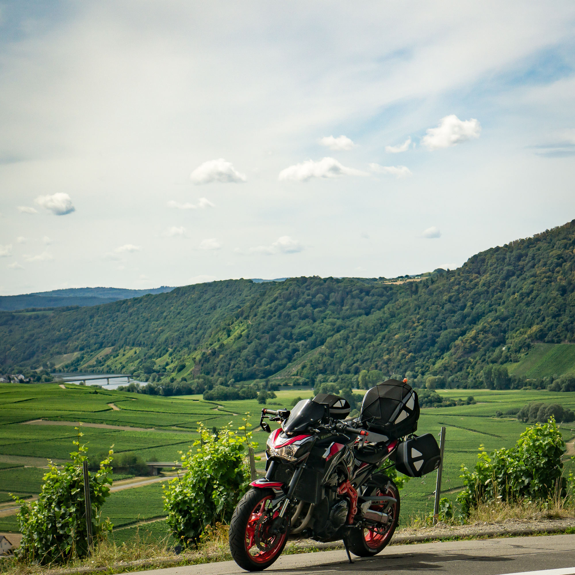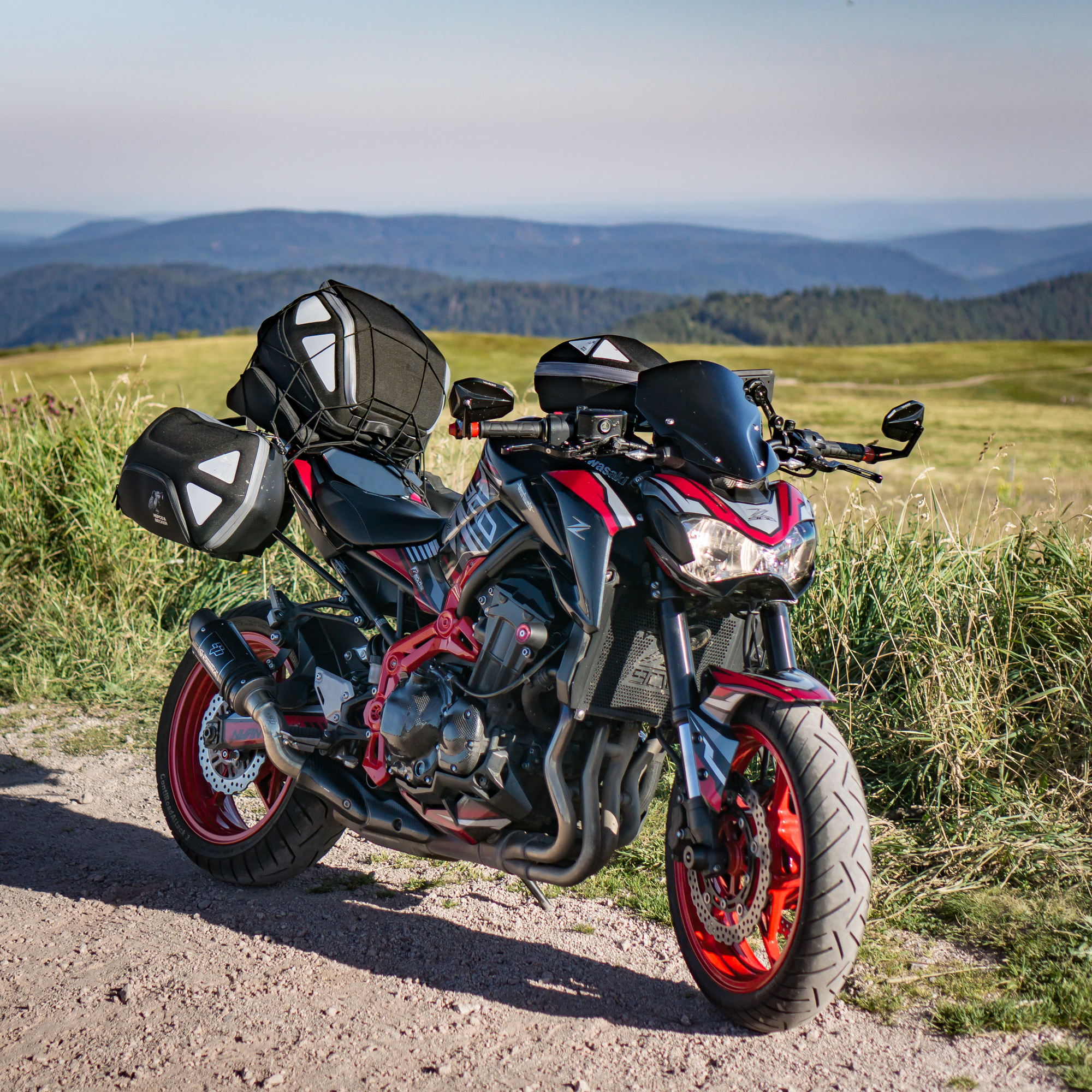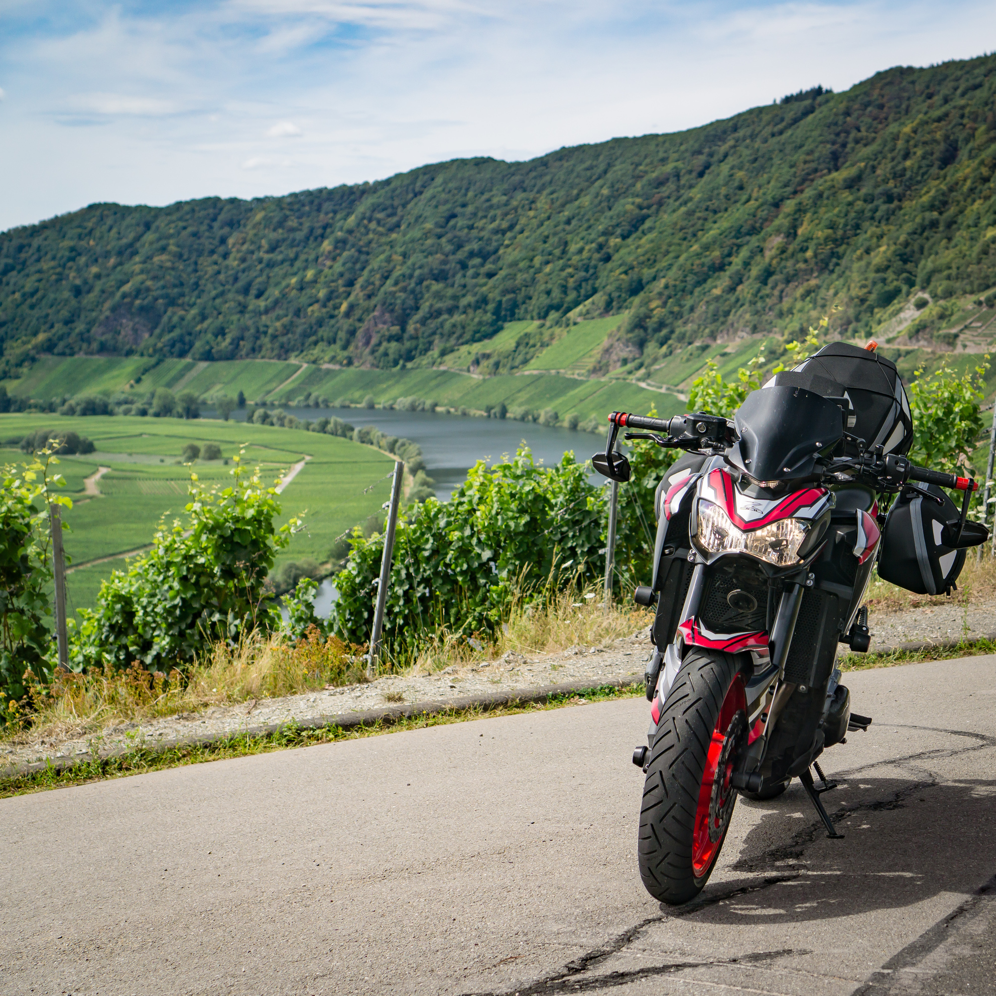 Das Problem: Wir wohnen 450 km voneinander entfernt (Wuppertal, Nürnberg) und wollen auf unseren sexy Naked Bikes (MT-09, Z900) nicht ständig Gepäck umherfahren und nicht jeden Tag ein- und auspacken.