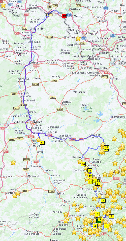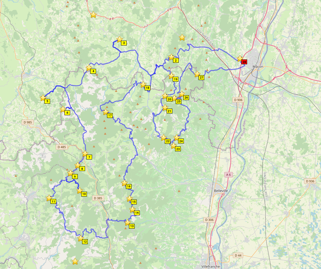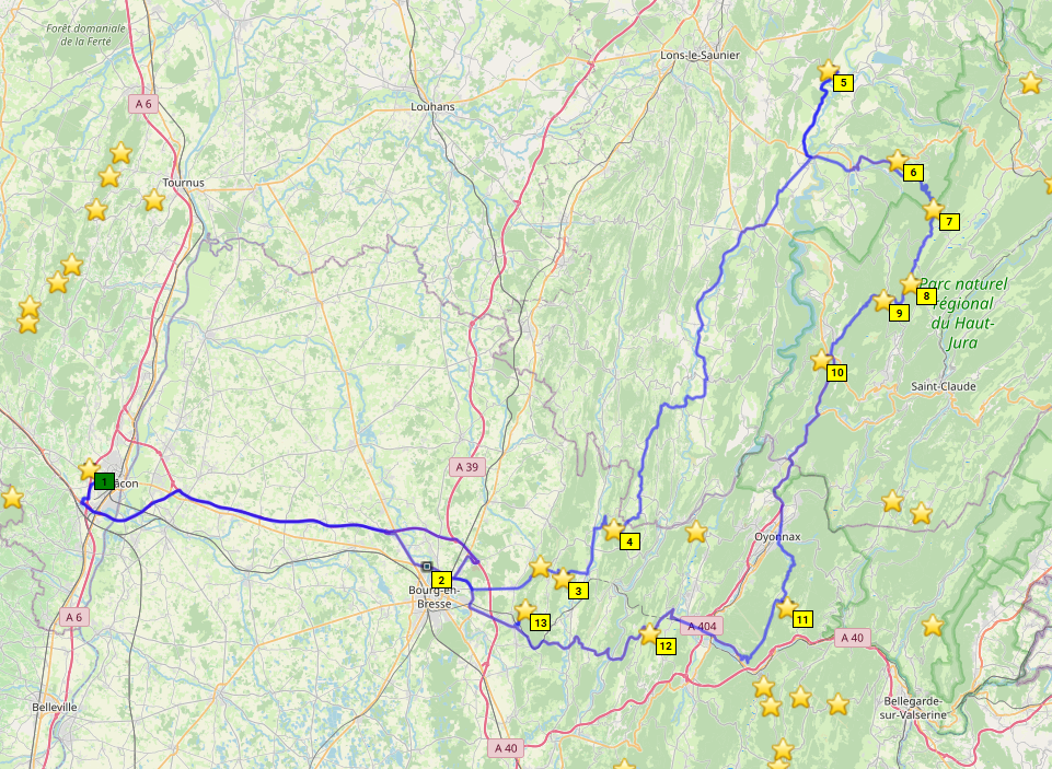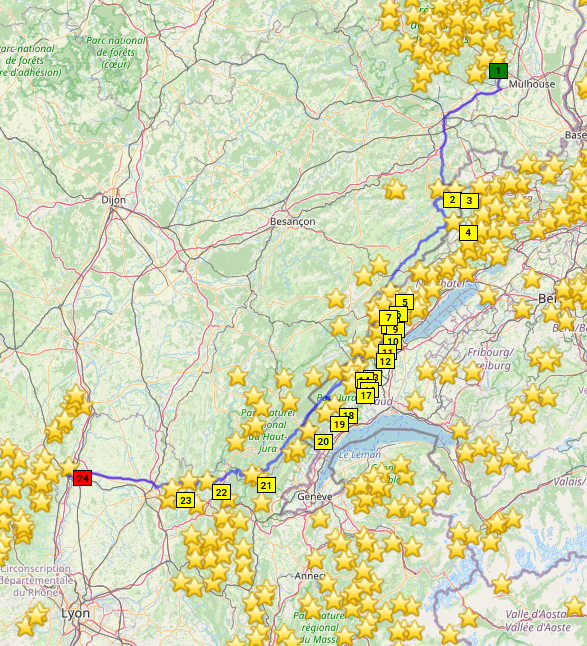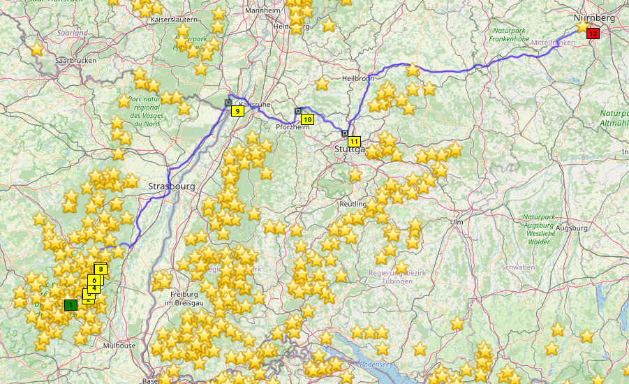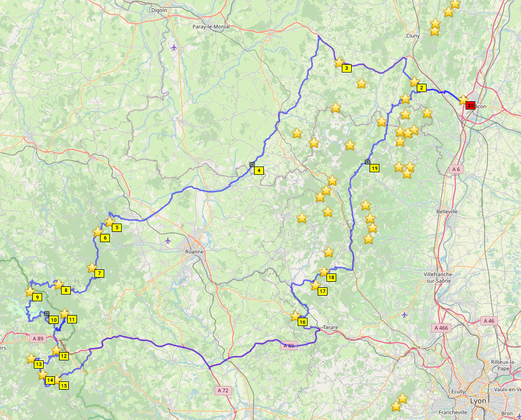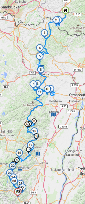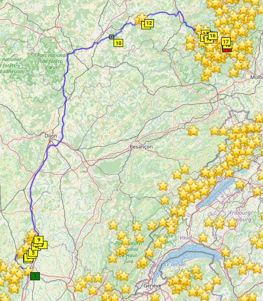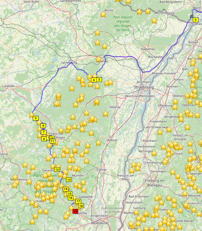 Die Lösung: Treffen abends in den Vogesen mit individueller Anreise, dort übernachten, dann gemeinsam ins zentrale Frankreich und dort Basislager so lange es die Urlaubstage (und Freundinnen) erlauben. Macon erscheint uns geeignet aus Basislager. Dann wieder in die Vogesen, nochmal übernachten und individuelle Heimreise.