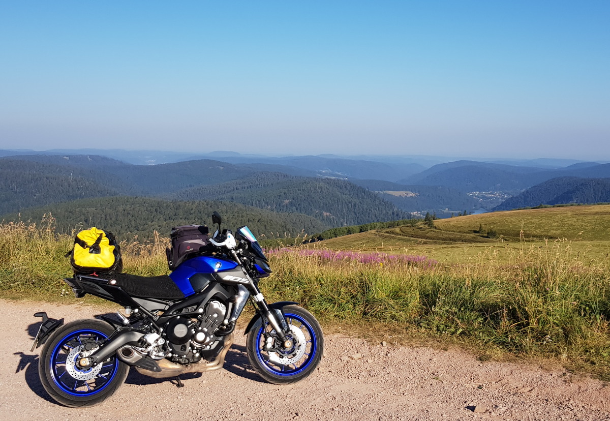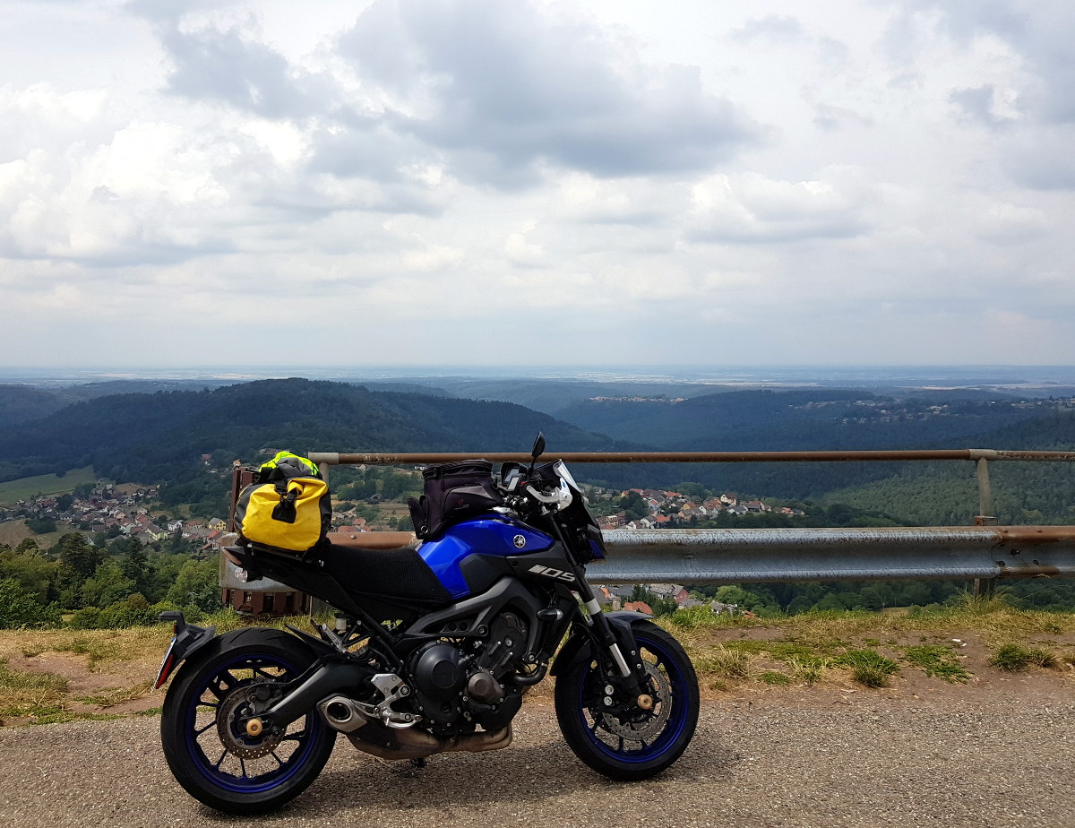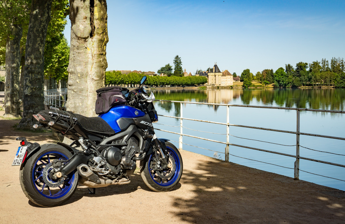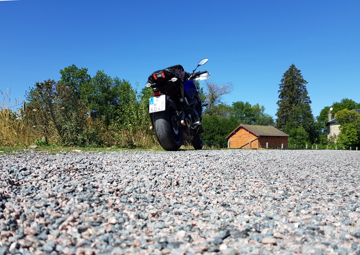 Die Yamaha MT-09 war aber einsatzbereit auf einem frischen Michelin Pilot Power vorn und einem 500 km angefahrenen Bridgestone S21 hinten. Der Fachmann wundert sich da vielleicht über den härteren Vorderreifen. Als Gepäcksystem habe ich mich für die Packrolle entschieden, weil das in Sardinien so gut funktioniert hat. Als Neuheit gibt es eine Klemme am Gasgriff, um Autobahnetappen zu erleichtern - da hatte ich zuletzt arge Probleme in der rechten Hand.