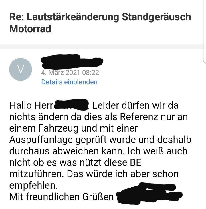 Mittels Anbauabnahme / Änderungsabnahme nach §19(3) StVZO durch eine Prüforganisation (DEKRA, TÜV, KÜS...) ca. 35.- Euro, kann die Lautstärkereduzierung in die Fahrzeugpapiere eingetragen werden (10-15.- Euro).
