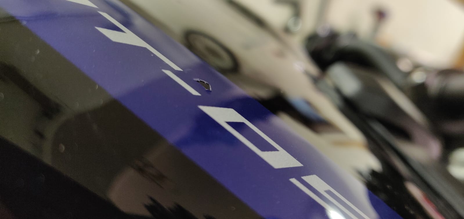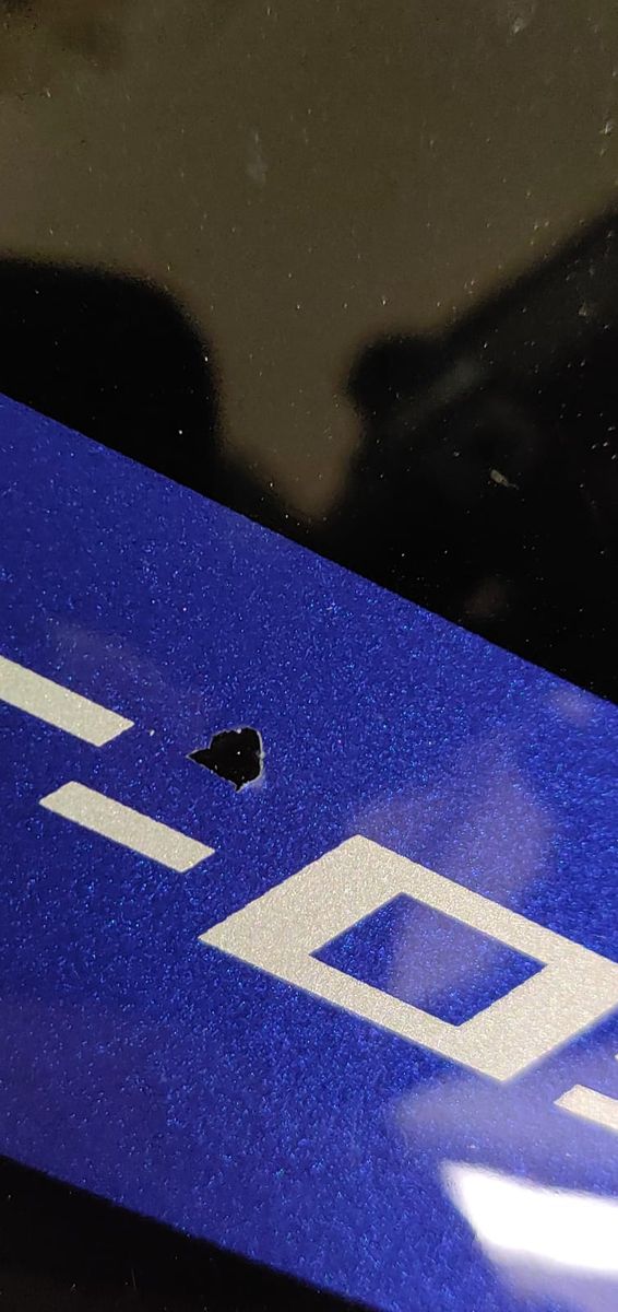 Vor ein paar Tagen ist mir während der Fahrt ein schwarzer Fleck auf dem blauen Streifen am Tank aufgefallen und ich hielt ihn vorerst für Dreck. Doch nach genauerem Betrachten stellte sich das als Lack-Abplatzer heraus. Es fehlt der Klarlack + blaue Lack. Zusehen ist nurmehr der schwarze Lack vom Tank. Dieser Abplatzer ist in etwas 10mm x 10mm groß und rundherum hat sich der Lack etwas aufgewölbt. Sieht fast aus als wäre eine Folie aufgeplatzt. Auf jeden Fall nicht wie ein Steinschlag. Auch die Position passt nicht zu einem Steinschlag, denn sonst hätte dieser Stein zuerst gegen mein Visier und dann auf den Tank fliegen müssen.