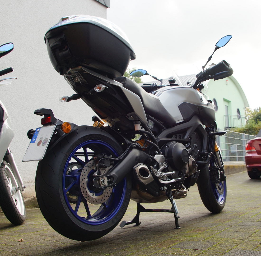 Montiert wird er von unten an den Gewinden im Heckrahmen (dafür müssen an den vorgesehenen Stellen Löcher geschnitten werden), und an den Blinkerhalterungen. Wegen der Blinkerhalterungen müssen die Blinker ab, und die Verkabelung getrennt und wieder verbunden werden. Damit ist ein schnelles ran/runter leider ausgeschlossen.
