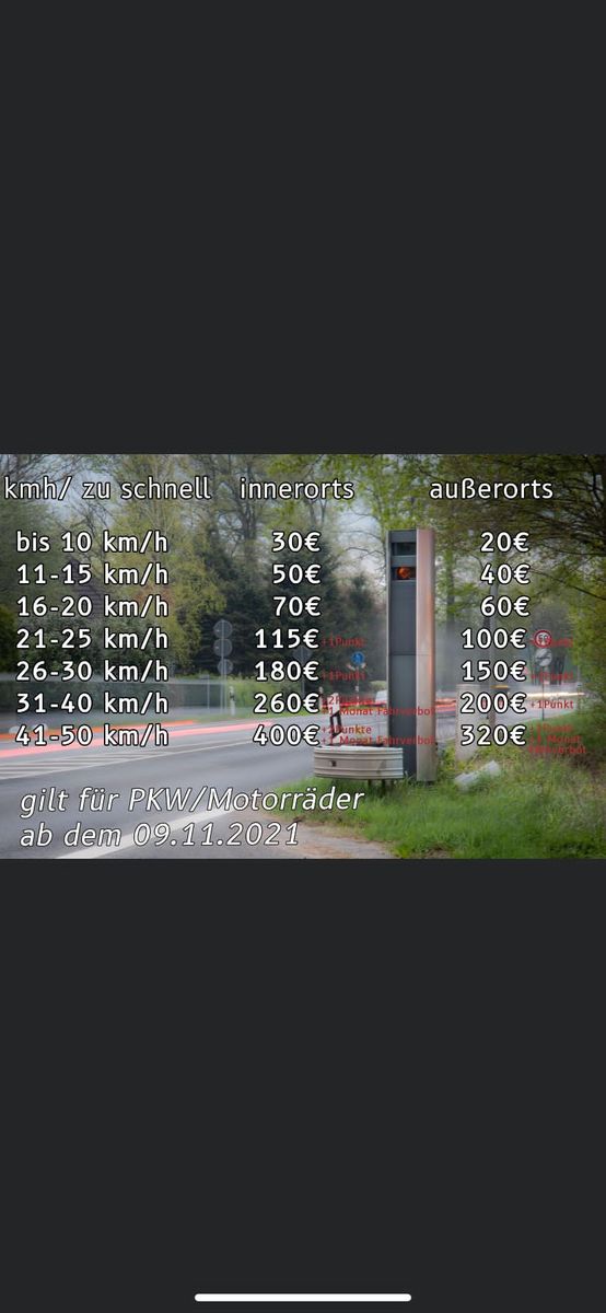 - 16 bis 20 km/h haben ein Bußgeld und eine Verwarnung zur Folge