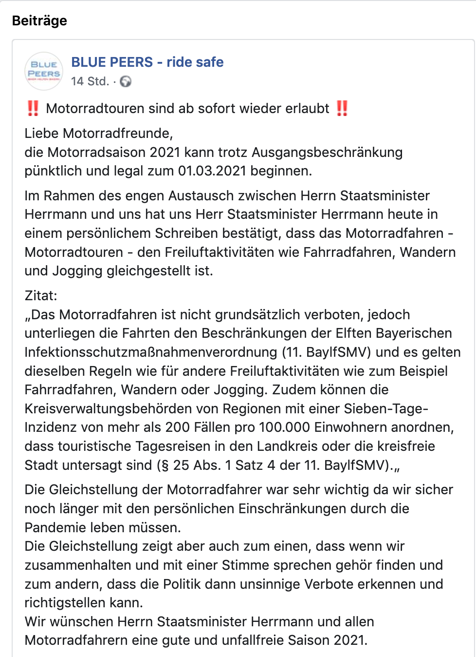 Ab 01.03.2021 gilt - zumindest in Bayern - dass das Motorradfahren/Motorradtouren den Freizeitaktivitäten wie Fahrradfahren, Joggen und Wandern gleichgestellt ist!