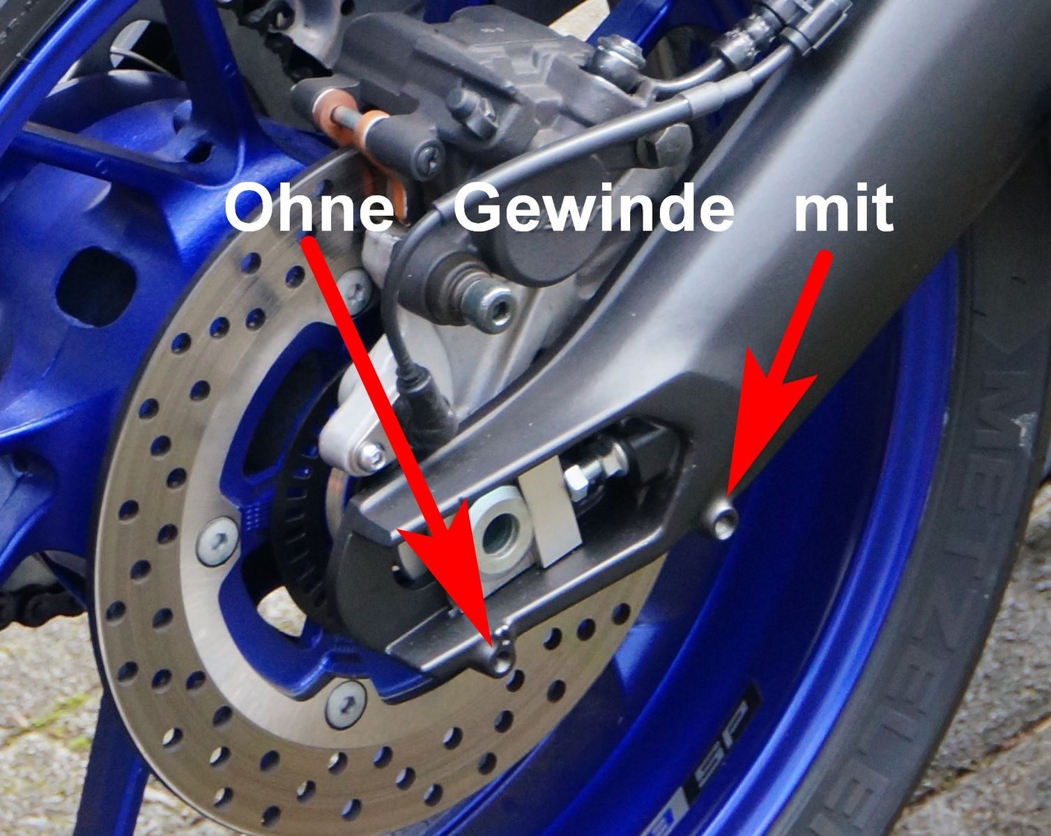 Schon klar, ich habe keinen Hauptständer an meiner MT und bocke sie auch dort auf. Dazu habe ich dort Aufnahmen angeschraubt. Aber wozu ein Gewinde in die andere Bohrung schneiden?