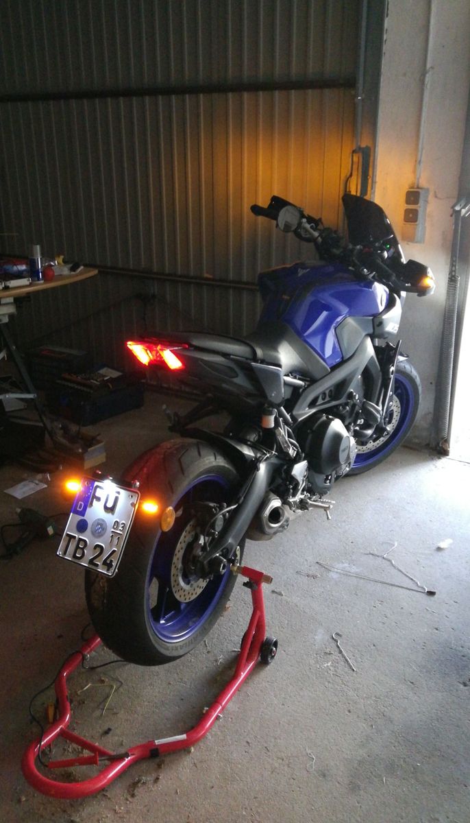 Ich habe vor einiger Zeit meine Blinker vom originalen Montagepunkt am Heck an einen nachgerüsteten Kennzeichenhalter an der Schwinge umgebaut.
