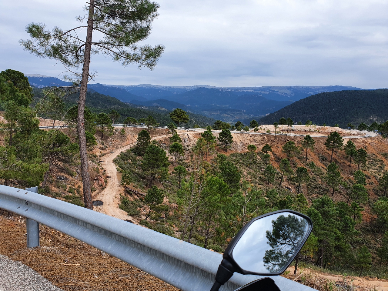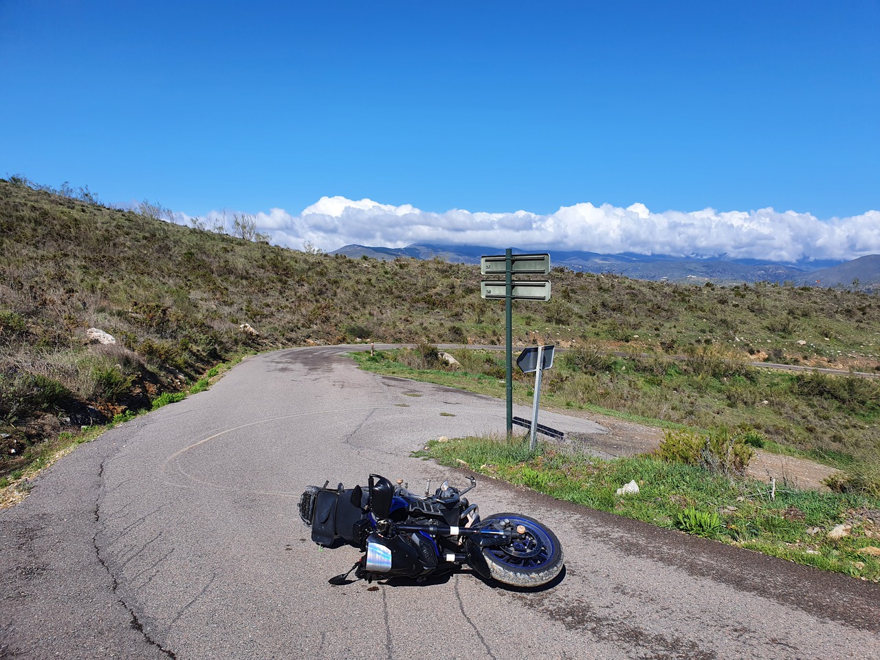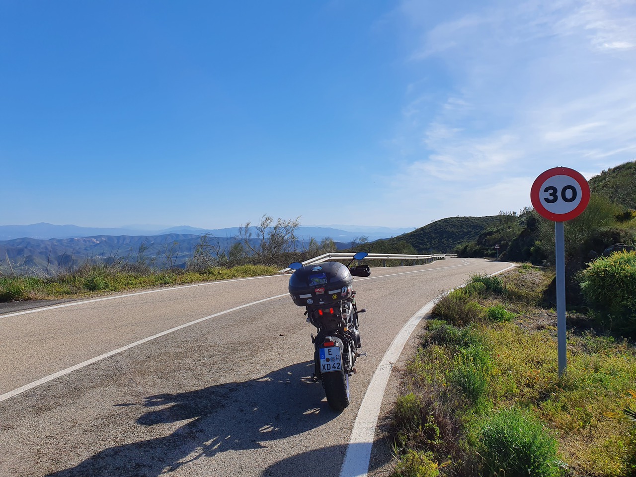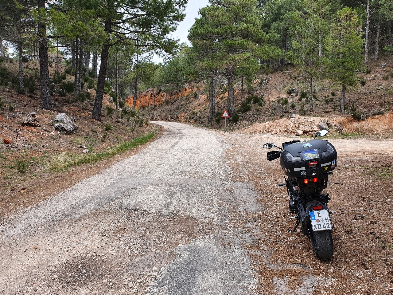 1. Durch Frankreich auf eigener Achse, quer durch Spanien, nördlich an Madrid vorbei, und dann Portugal von Nord nach Süd runter. In Portugal hätte mich jemand begleitet, daher gemütliche 350 km-Tagesettappen. Vom Südzipfel Portugals aus entlang der Gebirge in Südspanien nach Osten, insbesondere Andalusien, und im Südosten dann das Motorrad stehen lassen und heim fliegen. Dort 2 Monate arbeiten, und dann zurück fliegen, Motorrad aus dem Parkhaus oder Hotel ziehen, und: