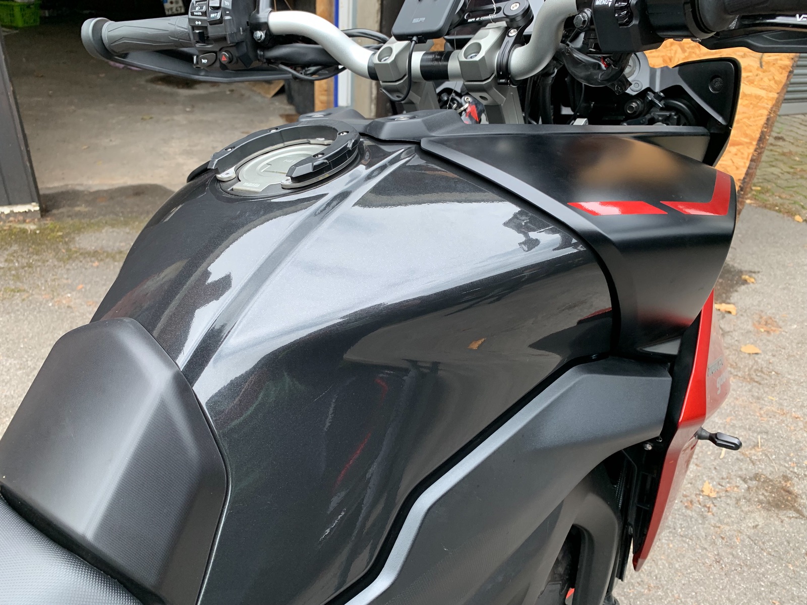 An meinem Vorgängermoped hatte ich einen magnetischen Tankrucksack in Gebrauch. Da wollte ich den Tank vorsorglich mit Lackschutzfolie bekleben. Diese war aber tatsächlich so dick, dass ich lediglich die Kontaktstellen mit passend rund zugeschnittenen Stücken beklebt habe. Die Folie hätte sich nie der Tankform angepasst, da sie sich beim erwärmen nicht zusammengezogen hat. Der Tank war matt lackiert und ich habe auch matte Lackschutzfolie verwendet. Dadurch fielen die Folienstücke nicht so doll auf. Habe sie aber nach meiner Urlaubstour doch gleich wieder entfernt.