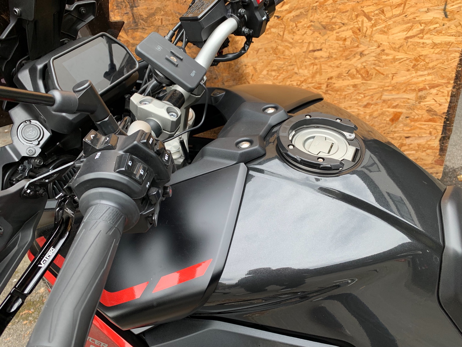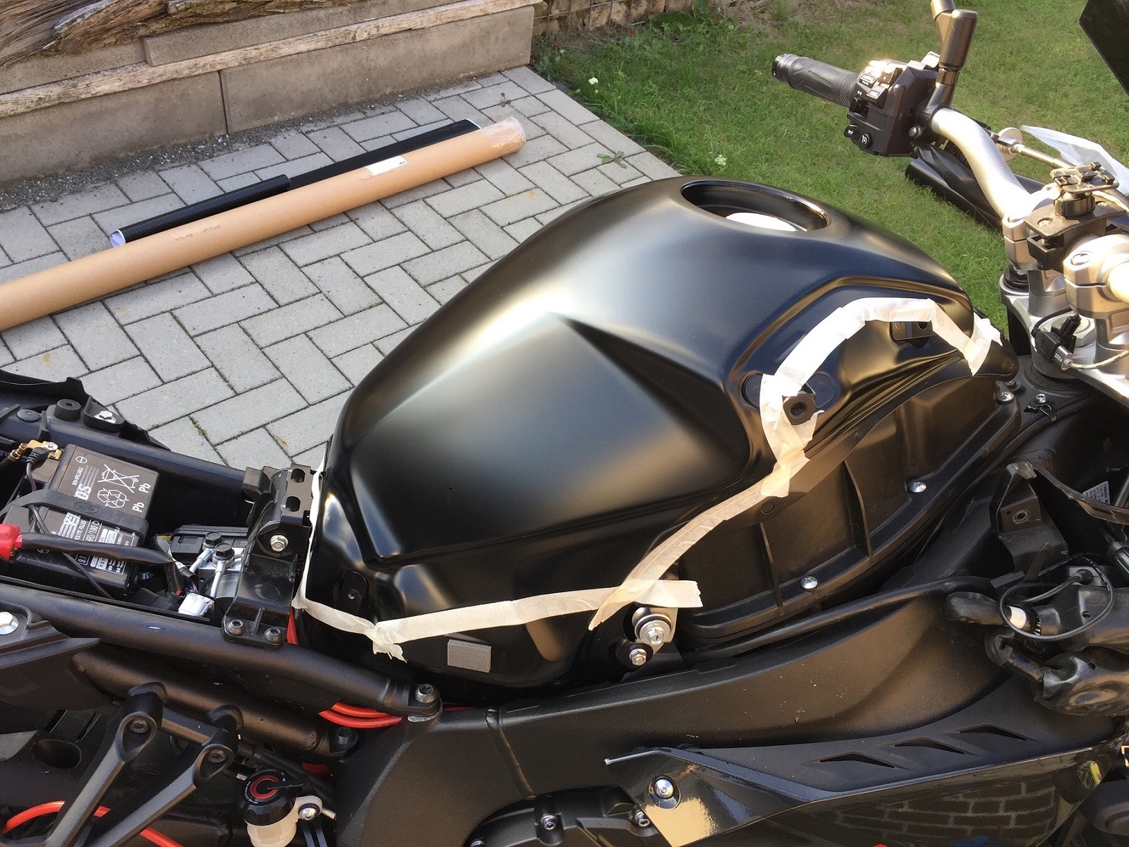 Ich habe gestern mal angefangen meinen Tank in schwarz metallic zu folieren. Folie ist von Oracal. Die Verkleidung die über den Tank sitzt wird die Tage nochmal gemacht. Ich persönlich finde, das schwarz matt immer sehr empfindlich aussieht. Ich hatte damals schon den Tank