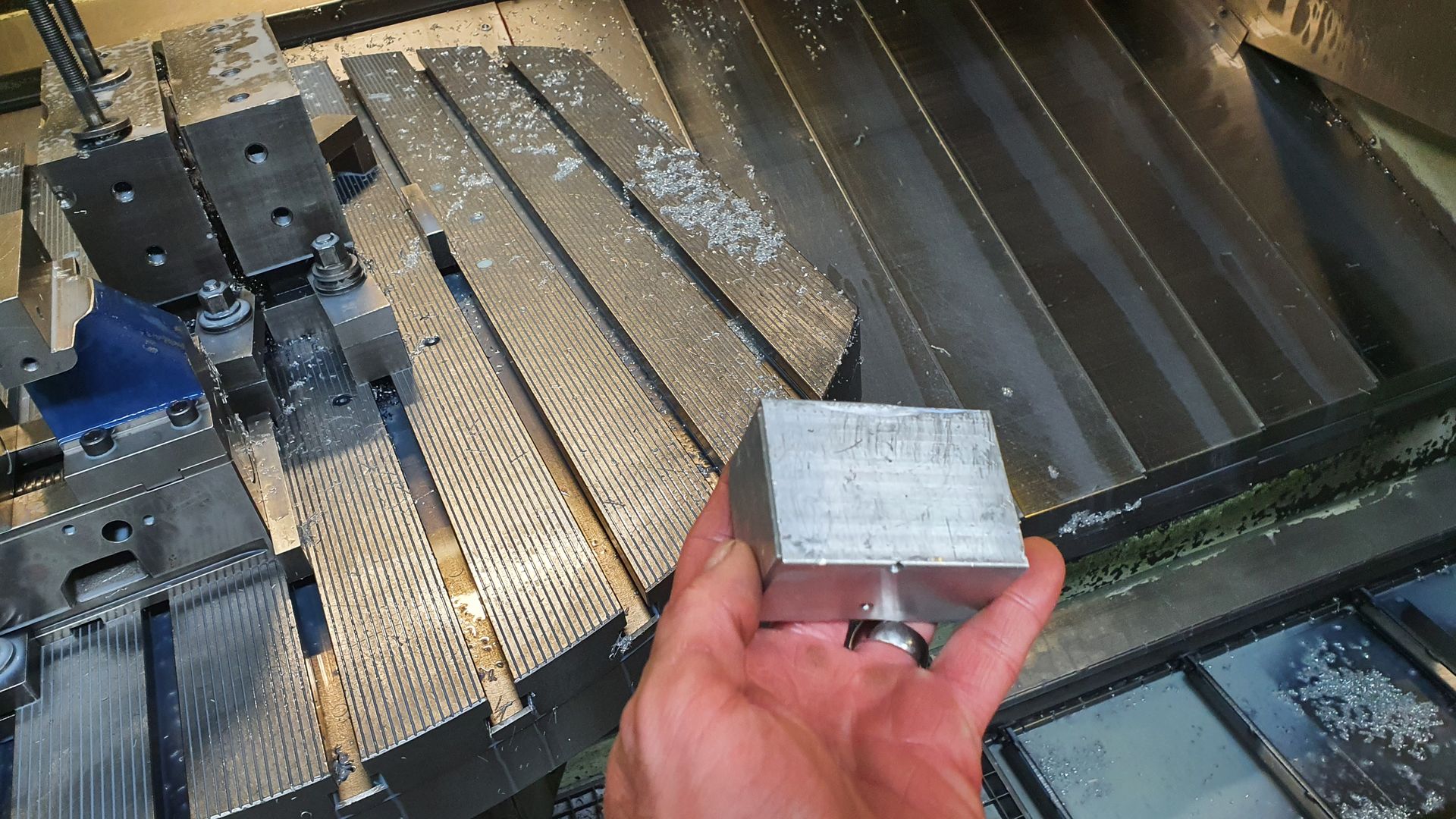 Ein kleines Abfall-Reststück aus Alu hat sich dann bereit erklärt, sich zur Zerspanung herzugeben und so wurde dann mit zunehmender Uhrzeit aus einem anfänglichem simplem Aluklötzchen wie auf diesem Bild hier ...