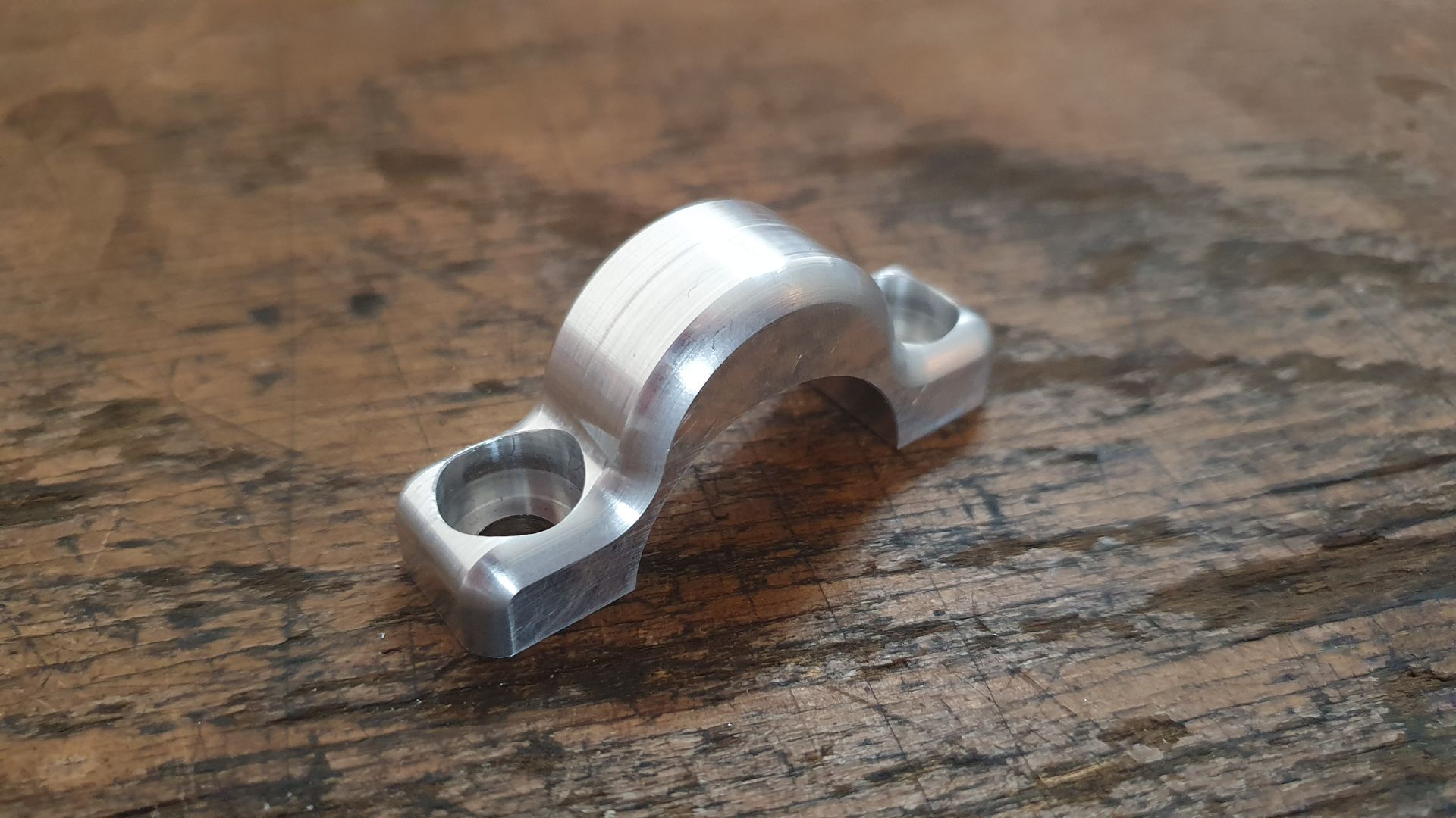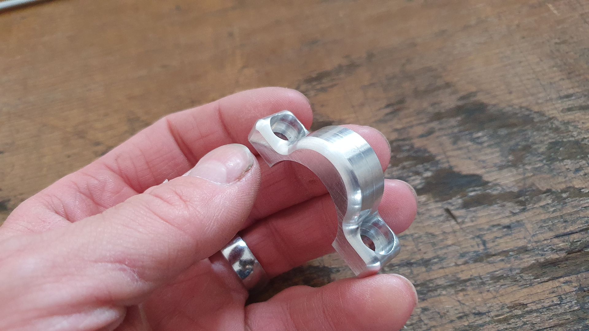 Daheim angekommen, gleich mal probiert, ob's passt und an dieser Stelle muß ich Chwenni dann mal ein Kompliment machen, weil er scheinbar den Durchmesser des Lenkers mit gemessenen 28.52 mm so exakt wie möglich ausgemessen hat, denn das Teil passt perfekt auf das Lenkerrohr, und ich habe die halbrunde Öffnung mit einem Radius von 14.26 gefräst.