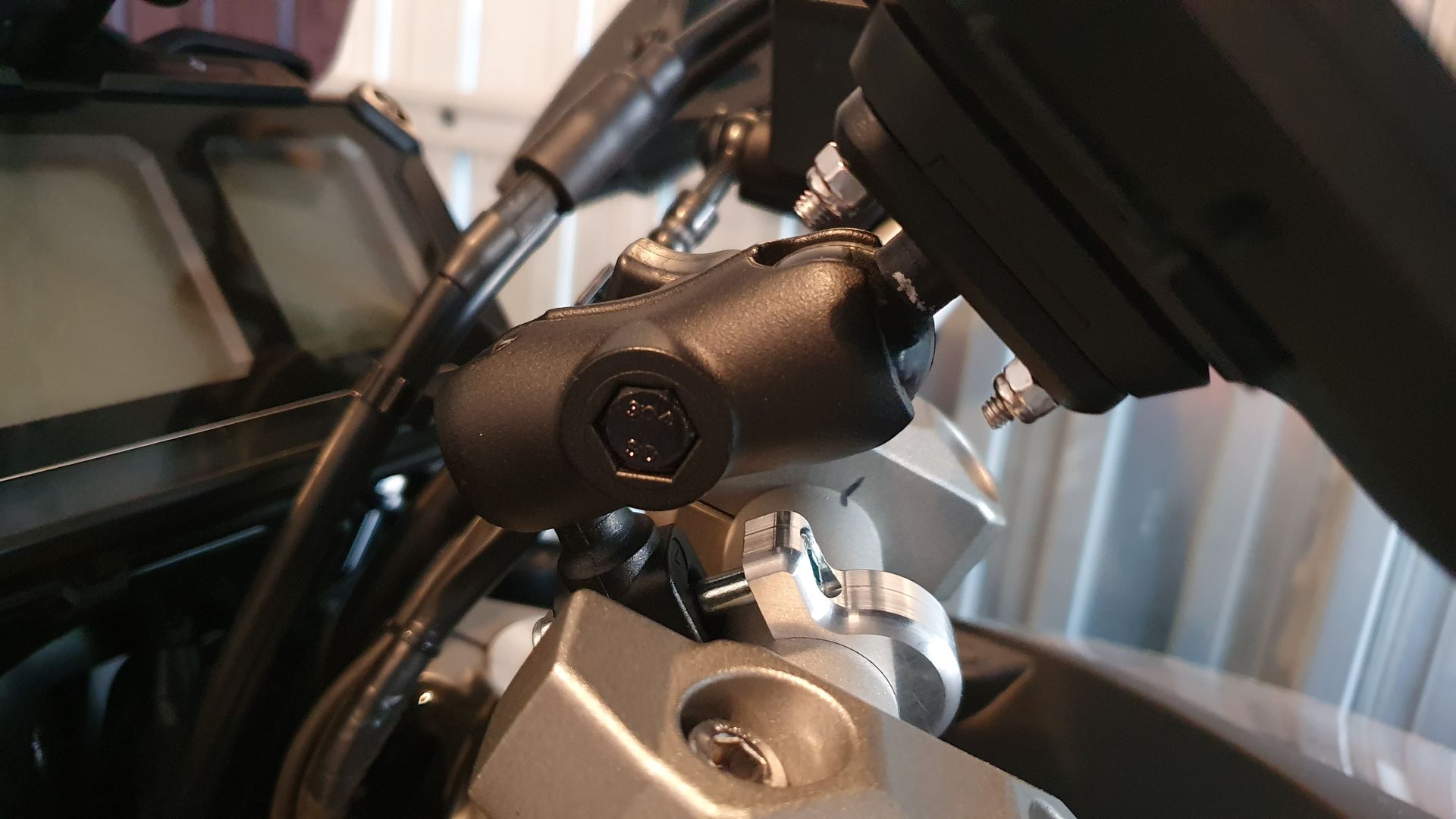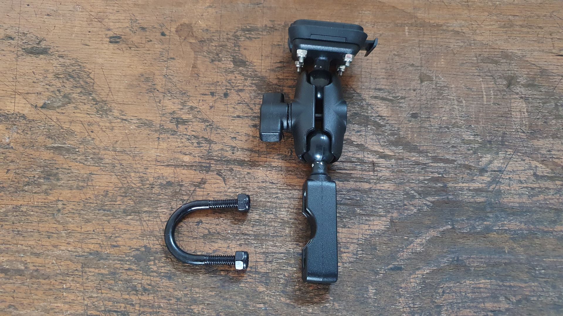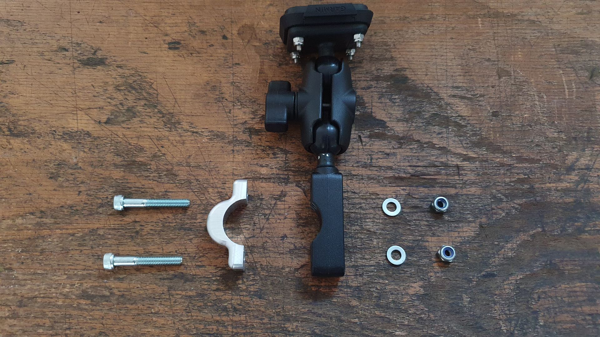 Die Idee dazu ist diese Woche über schon in mir gereift, als klar wurde, daß zusätzlich noch eine alternative Navihalterung passend zur Powerbronze Scheibe gebaut werden und diese dann wohl am Lenker befestigt werden muß. Das Problem war ja aber bei der Befestigung am Lenker, daß ich einfach nirgends, wirklich nirgends einen passenden U-Bügel herbekommen konnte, den ich gebraucht hätte und der mitgelieferte von Garmin ja bekanntlich deutlich zu kurz war, zu sehen auf dem Bild: