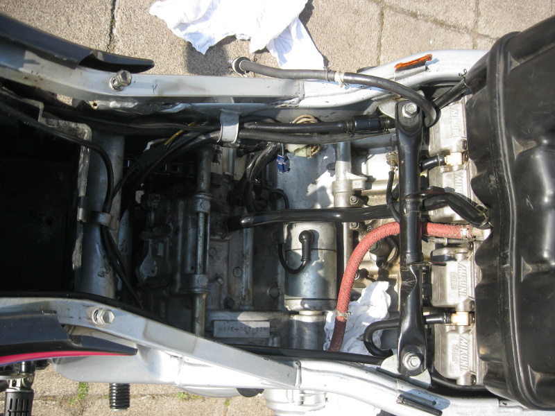Alles demontiert, Verkleidung, Tank u.s.w. und dann Kraftstofffilter ab und neuen dran....Ätsch...neuer passt nicht, obwohl für die 3HE ....Naja, passte nicht also neuen bestellt und kommt am Dienstag. Somit steht die FZR jetzt etwas ausgeweidet/abgedeckt in der Garage ?(